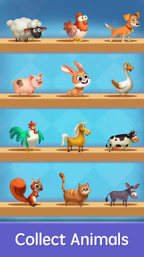 You can collect dozens of different animal to fill up your farm. Cute animals will live happily on your farm. In the meanwhile, You can rebuild your farm step by step in up to 6 scenarios and experience a different farm scenery. More animal and scenes will be added to the game in subsequent updates. So just download the game and enjoy it.