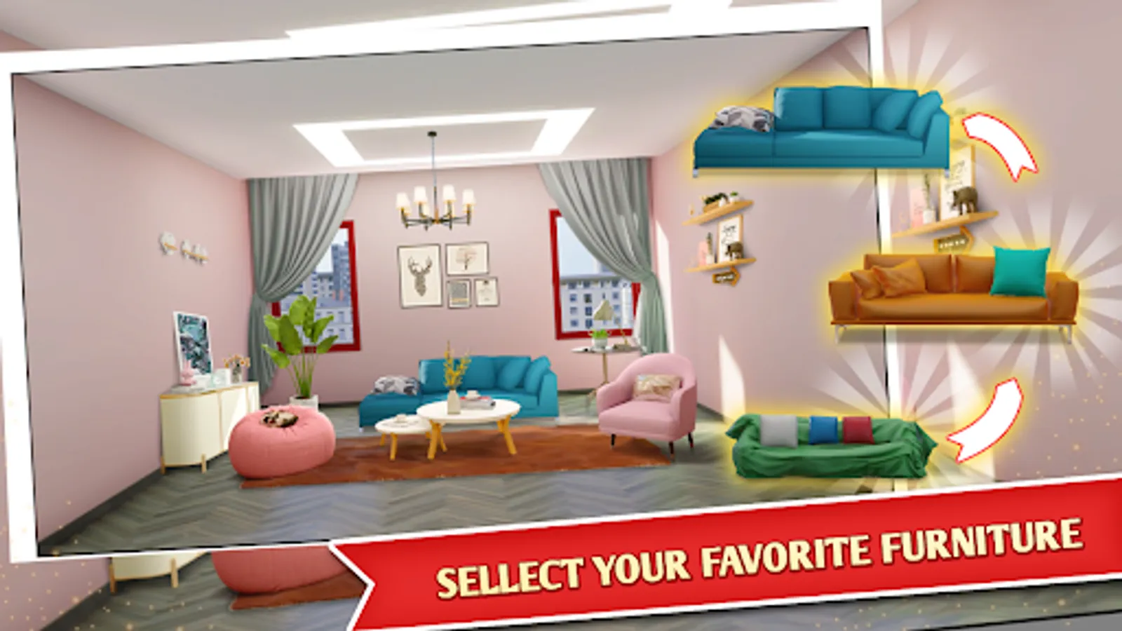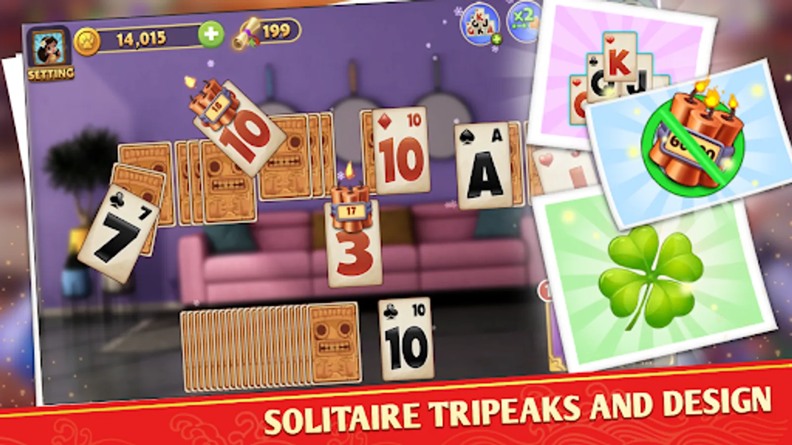 As the player clears cards from the playing area, they will earn coins that can be used to purchase new furniture and decorations for the homes they are designing. The game also includes power-ups that can help players clear cards more quickly, such as the ability to shuffle the cards or reveal the next card in the deck.