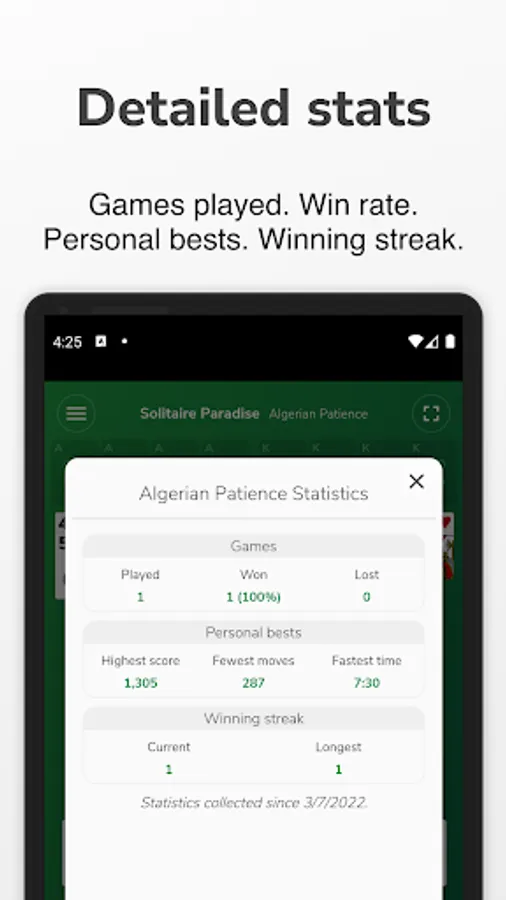 - Detailed stats (# of games played and won, win rate, fewest moves, fastest time, win streak)