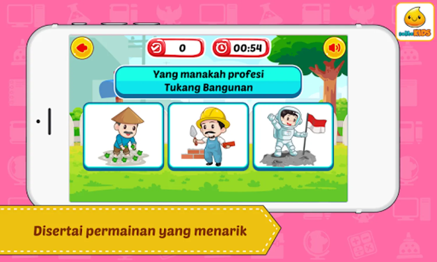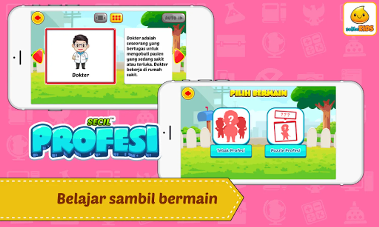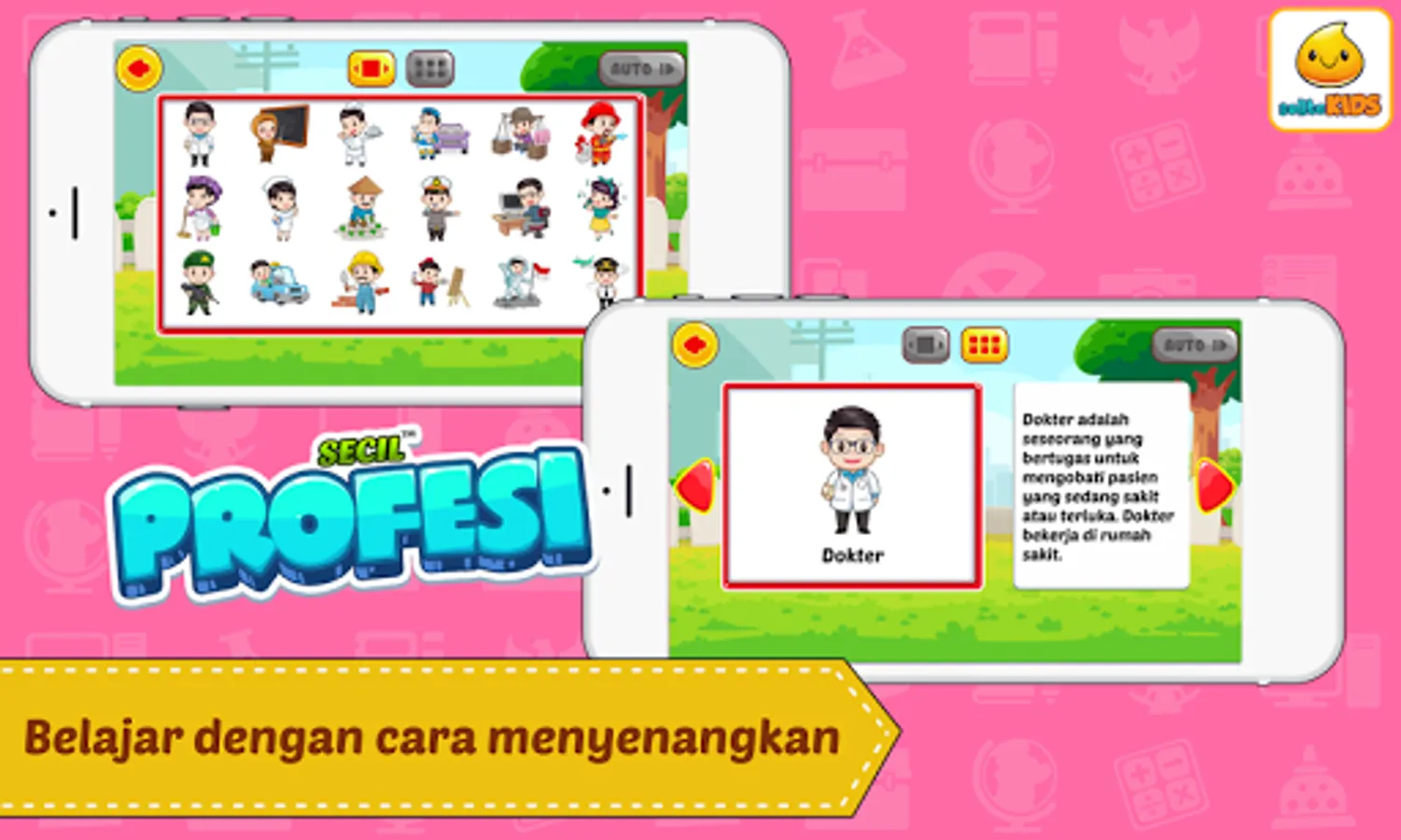 In the sport children will learn to recognize professions ranging from traders, farmers, teachers, police, doctors, mechanics, programmers and other professions. The concept of learning to know the profession work in this application is designed to interactively with games interesting and attractive voice so kids do not get bored while playing familiar professions