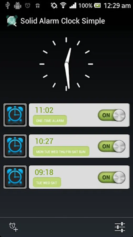 It is simple version of Solid Alarm Clock. If you want to have alarm clock with more flexibility and with alarm modes you need to install Solid Alarm Clock Extended for free.