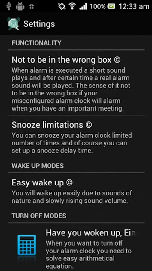 3. "Strong wake up"©. If you haven't woke up after sounds of nature you will hear extremely loud and dynamic alarm sounds with vibro which repeats infinitely.