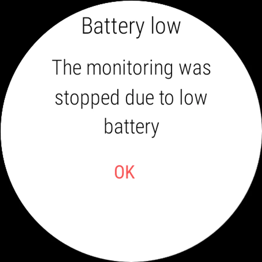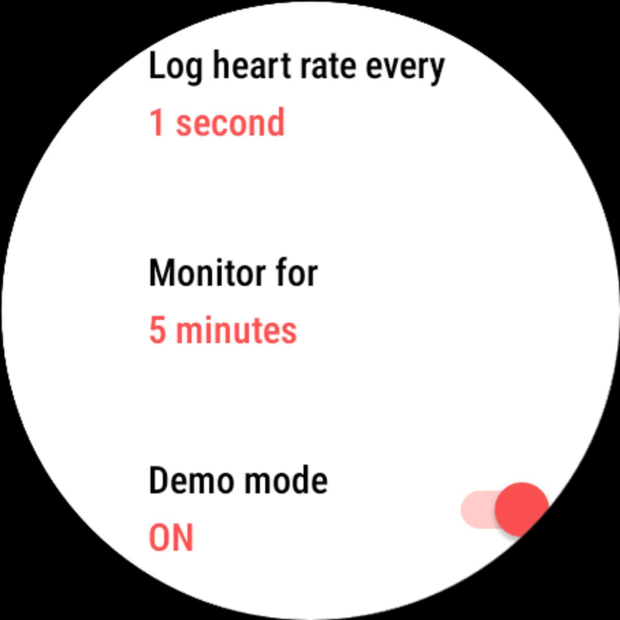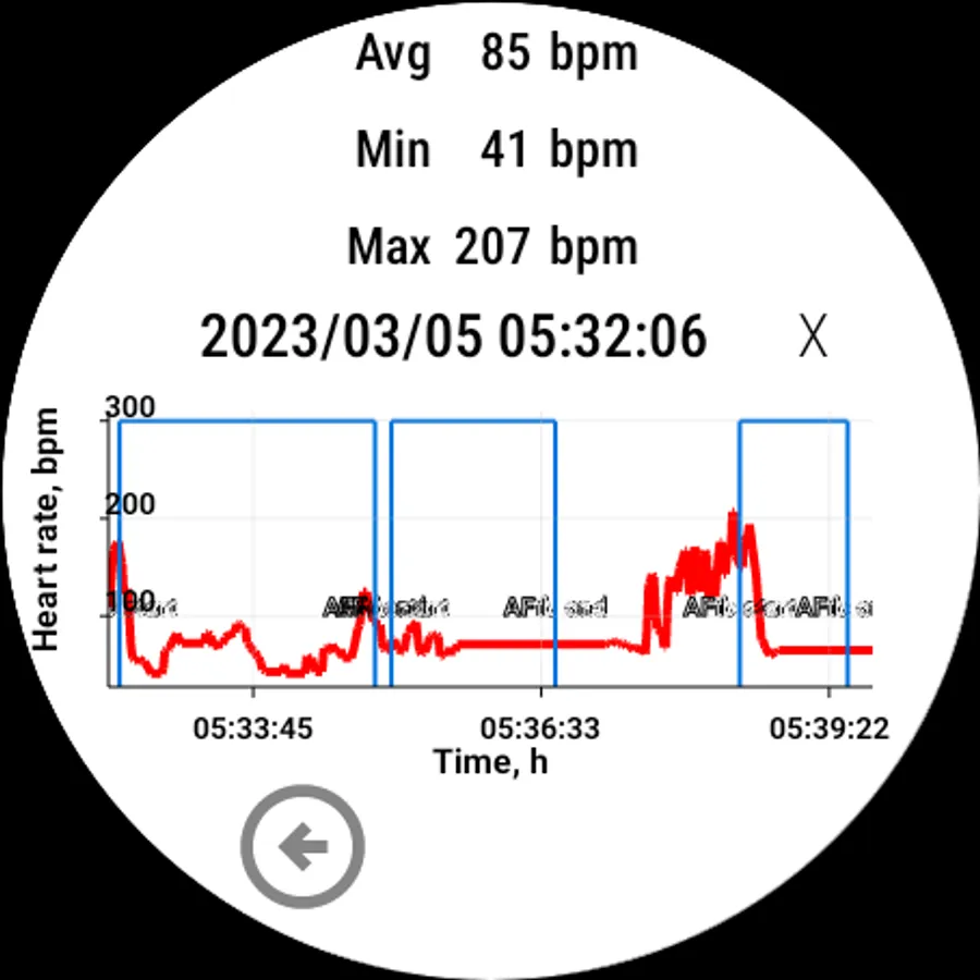In order for the application to work, the "demo mode" should be turned off in the settings and the wrist-worn device must be fastened on the wrist. Pressing play/stop button starts/stops monitoring. The left button enters settings, while the right button opens the heart rate chart. When monitoring is initiated, the application checks whether the default optical sensor is available and in case it is not, the application would either ask user to continue or quit the application. If user choses to log heart rate, it will be displayed in the log screen (accessed by pressing right button). If atrial fibrillation function is enabled in the settings and it atrial fibrillation was suspected during the monitoring, log would also include boundaries of the detected atrial fibrillation episode by marking it with blue lines (see screenshots). The wrist-worn device would vibrate three successive times (if this functionality was enabled in the setting) if the episode of atrial fibrillation was suspected and two successive times when it ended. The monitoring is stopped automatically when battery charge drops to 15%.