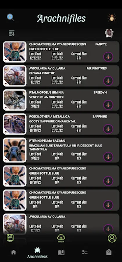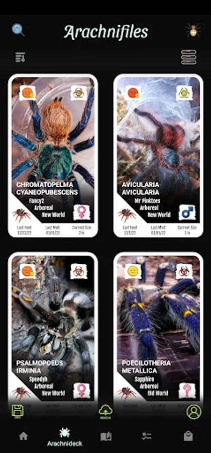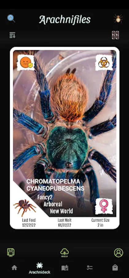 Arachnifiles is not just any tracking app - it's a visually stunning, card-style app that lets you keep track of all your favorite inverts in an interactive way. From Amblypygi to True Spiders, and everything in between, Arachnifiles has got you covered. You can track multiple feeding schedules, molts, substrate changes, and even note your pets' growth rate!