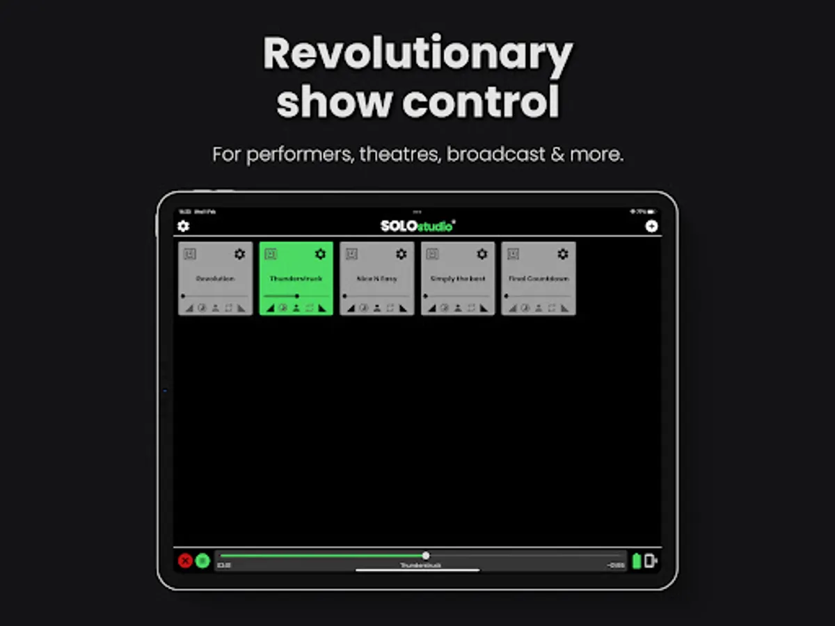 By connecting your SOLO device to SOLOstudio you now have the power to control all of your show cues without ever touching a button. Start and stop tracks, cue specific tracks and more with this revolutionary show control system. With SOLO & SOLOstudio you can...