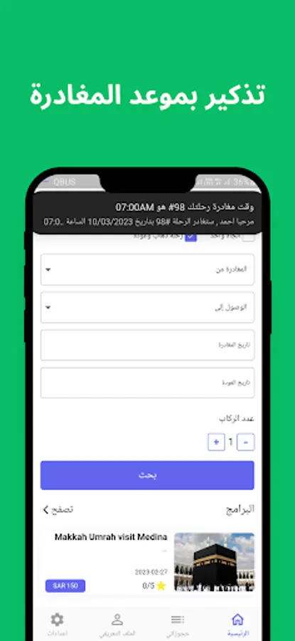 It allows the customer to review the companies that provide land transportation service for those wishing to travel to and from the cities of the Kingdom of Saudi Arabia and the Gulf countries, so that the platform operates with an electronic reservation system for those wishing to travel with specifying travel dates and the number of passengers without any difference from flight reservation systems, and the platform also provides a separate application for land transport offices Hajj and Umrah campaigns to enable them to add trips and manage them with ease.