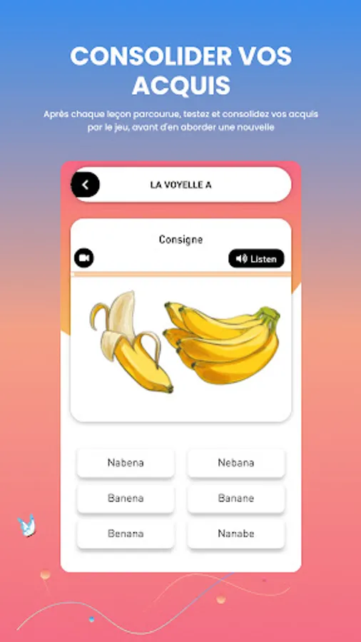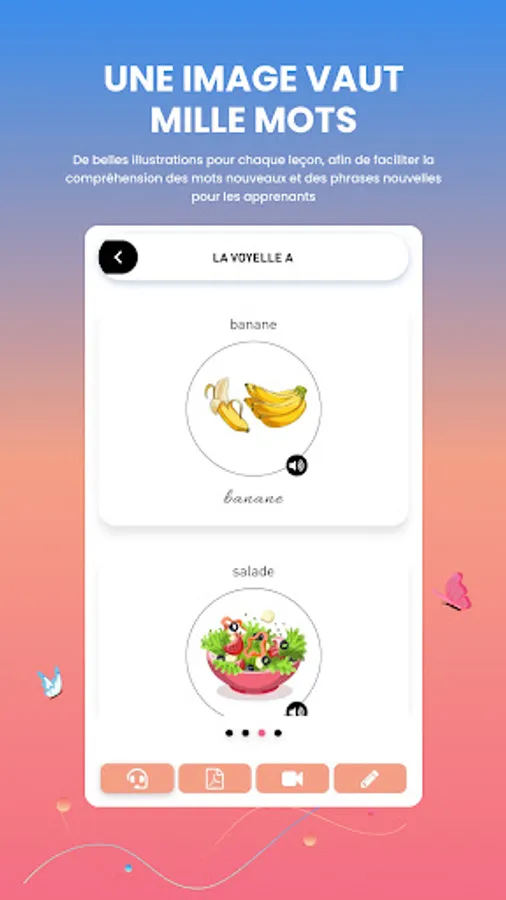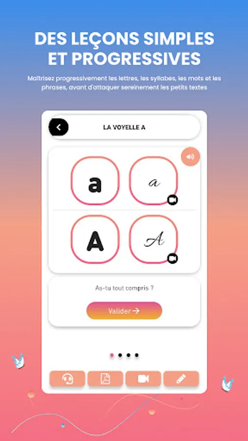 • Simple and progressive lessons, starting with the alphabet up to small simple and practical texts, passing through syllables, words, sentences related to everyday life.