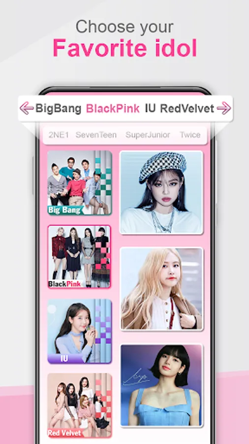 The application includes 10 categories corresponding to 10 famous idols and Kpop groups :
