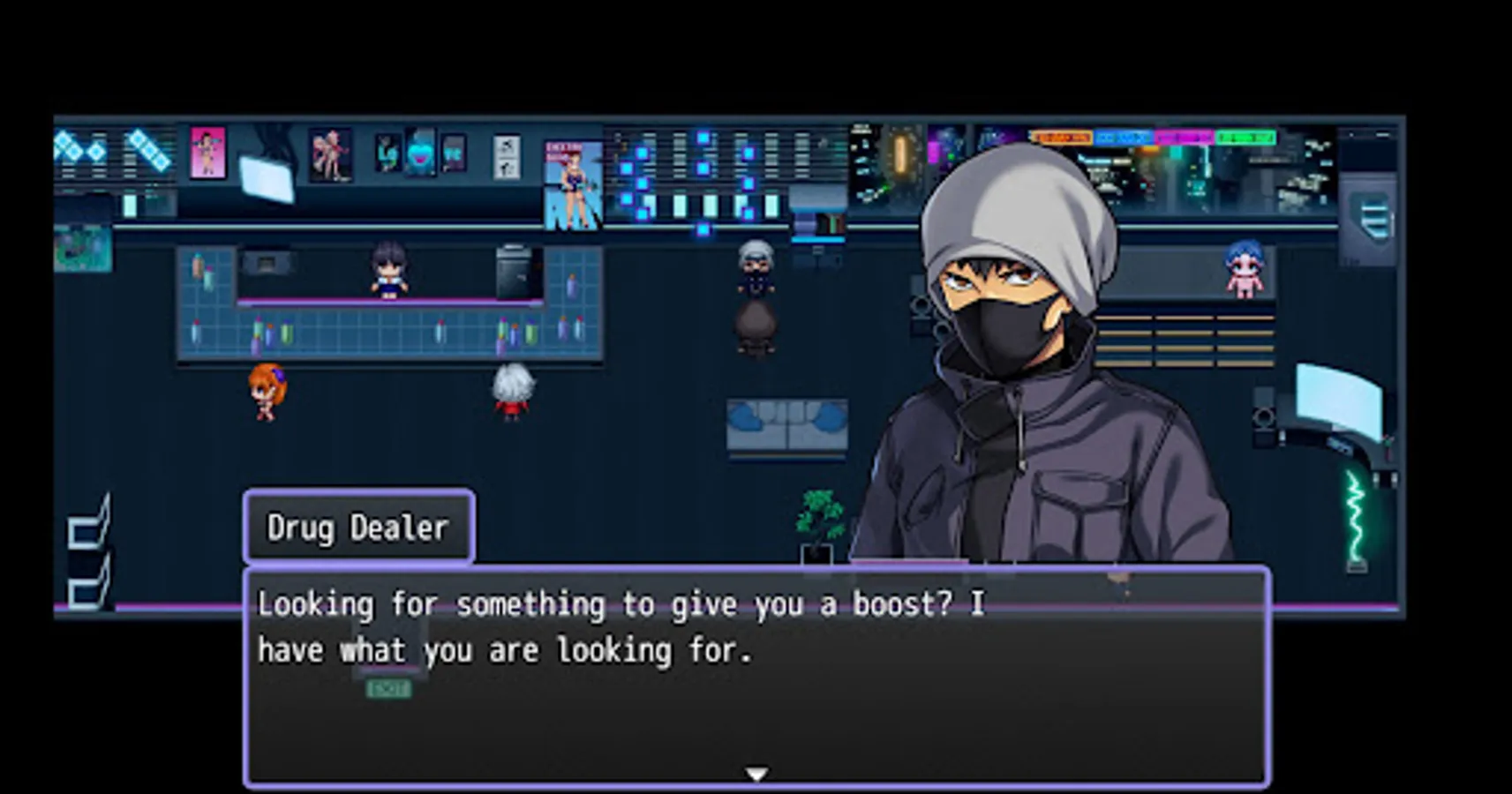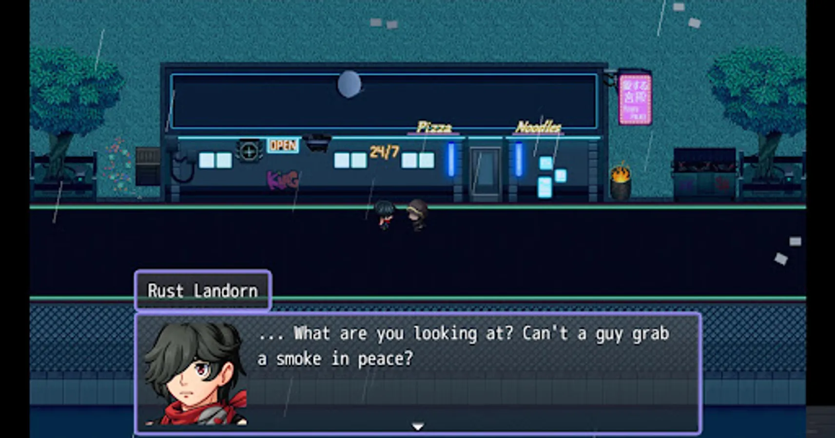 The goal is freedom for the player. You can pick and choose what you will do in this retro-style 2D world. Battles are a big part of the game, and are turn-based. Neopunk features detective elements (like exploring a crime scene for clues), and fighting enemies. Exploring and finding new things is key. And yes.. you can even deliver pizza. Plus explore a part of the city where catgirls live. All while rocking out to a synthwave cyberpunk soundtrack.