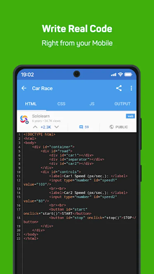Our online code editor lets you write code, run programs, and share ideas from your phone for free. You can practice coding languages highly in-demand right now: Python, Java, C++, Ruby, HTML, CSS, C#, SQL, and JavaScript.