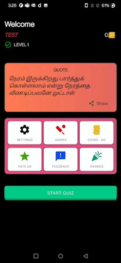 With a user-friendly interface, the Tamil Quiz app offers a variety of multiple-choice questions in various categories.The app includes different levels of difficulty, ranging from Level 1 to Level 44 which allows users to challenge themselves and improve themselves.