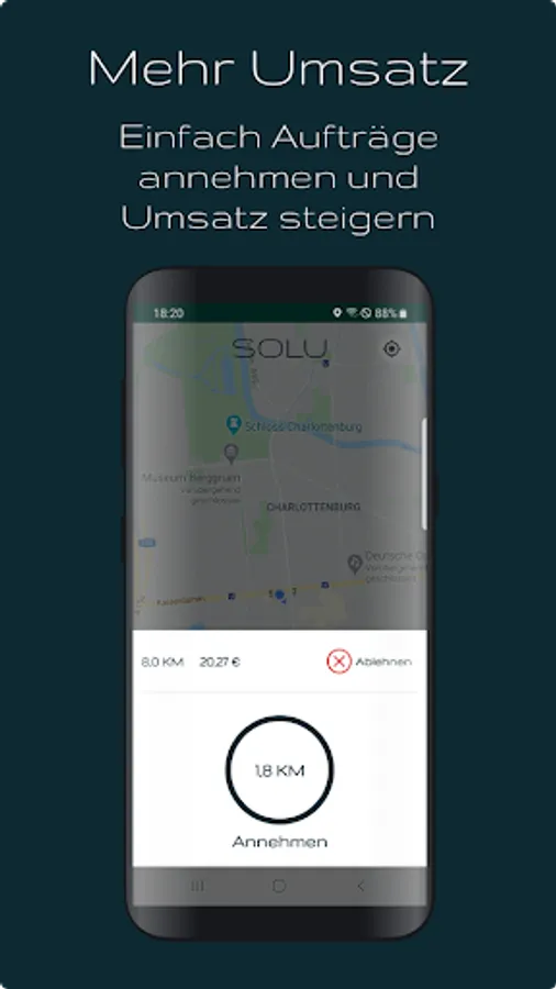 With the driver app we simplify the placing of orders. Orders that arrive at your headquarters can be forwarded to a suitable driver. He receives the order on his driver app with appropriate navigation to the pick-up location. If an order is accepted accordingly, the passenger can follow the arrival of the driver. At the pick-up point, we offer the possibility of direct communication between passenger and driver in order to ensure a smooth pick-up. After confirmation of the pick-up, navigation to the destination address is started. At the destination, the passenger pays for the journey in cash or by app. The trip turnover is displayed in the app and can be checked.