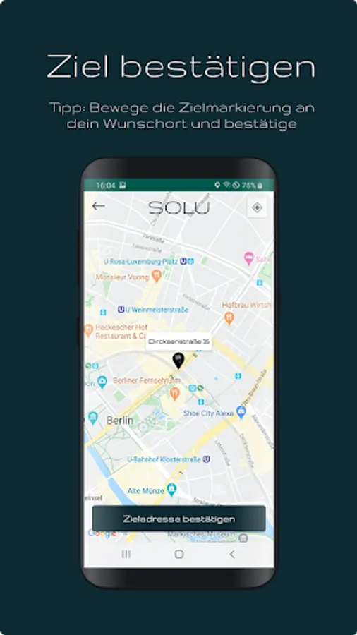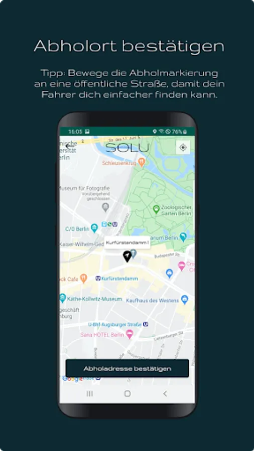 Reach your destination comfortably - we take special care to provide you with high-quality vehicles. Book comfortably via the app and we will take care of the rest. Your driver will pick you up and drive you to your destination. With SOLU you can now easily book your trip in Berlin using the app and sit back. You will be picked up by your driver and driven to your destination. Arrive stress-free and relaxed.