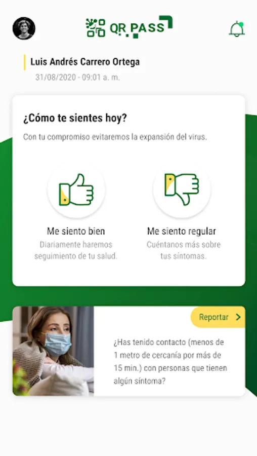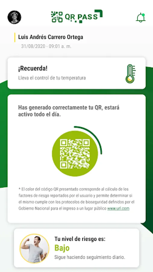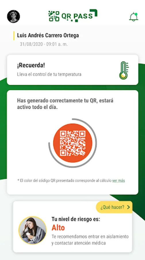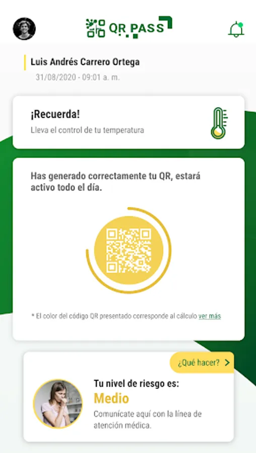 At Seguros Bolívar we want to be part of the tranquility and well-being of all Colombians. This is why we created QR PASS, a real-time health monitoring and self-diagnosis tool. Through some simple information and performing some breathing and temperature exercises, you will be able to obtain a QR PASS that will quickly show the daily diagnosis with your exposure to the risk of your health and those around you.