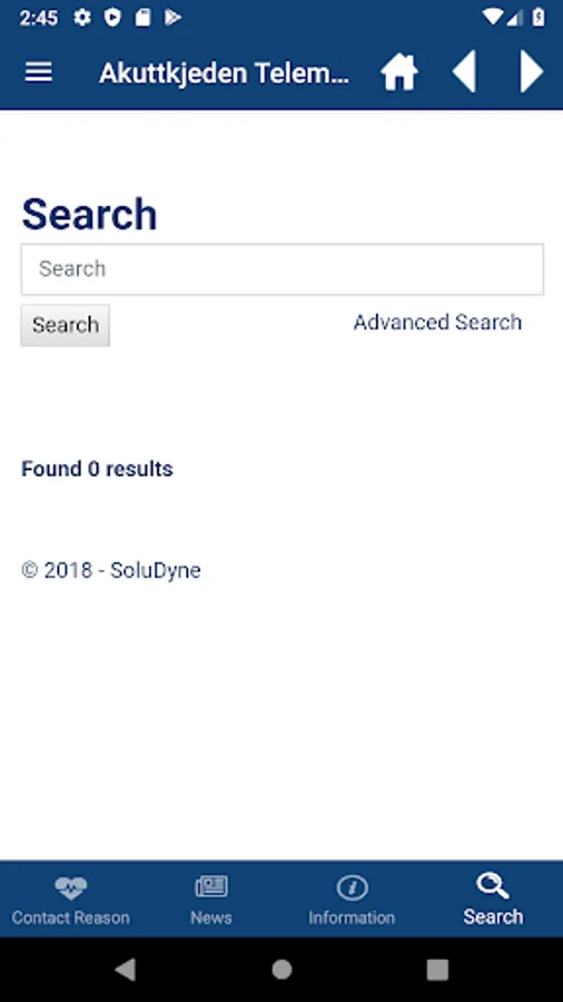 The app has a first page where the menu with Contact Cause, Search, News and information about the Emergency Chain is displayed.