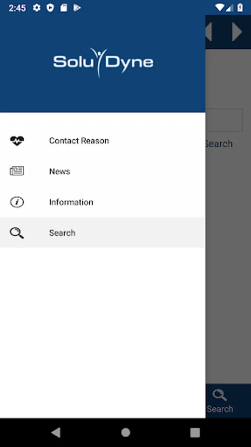 The Hamburger menu at the top of the app displays the menu options Home, Search, News, Contact and About.