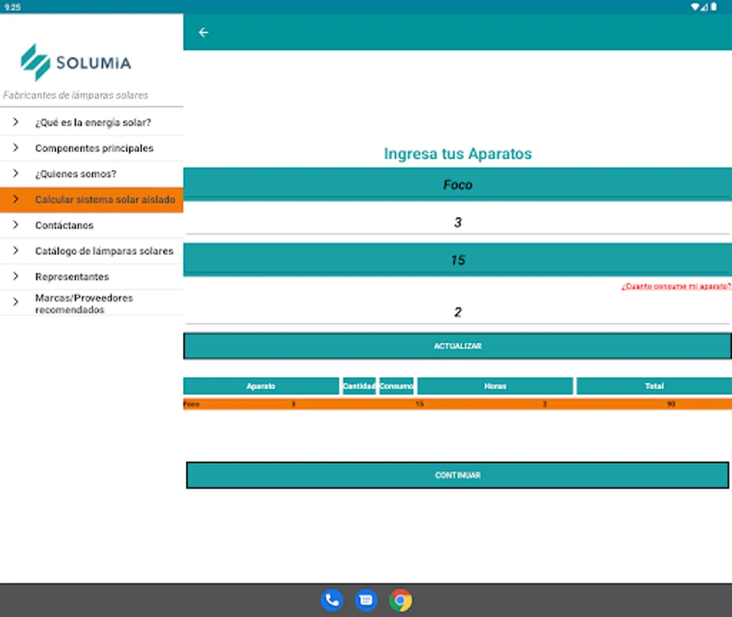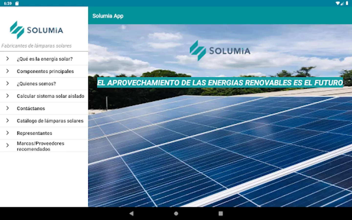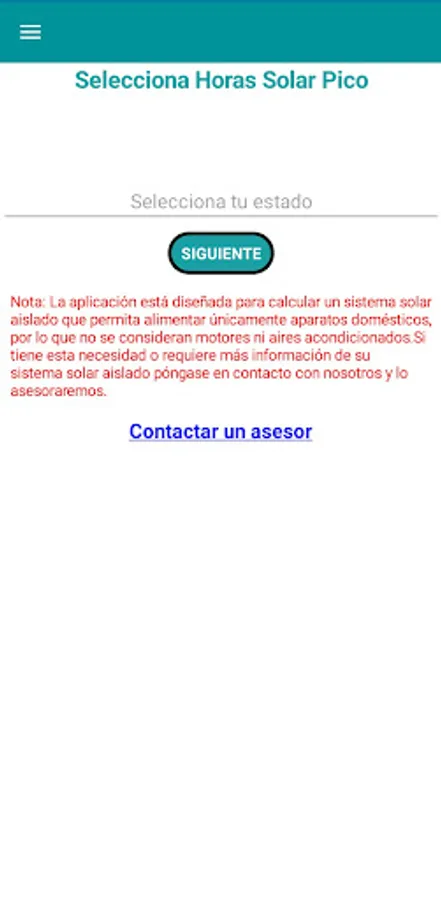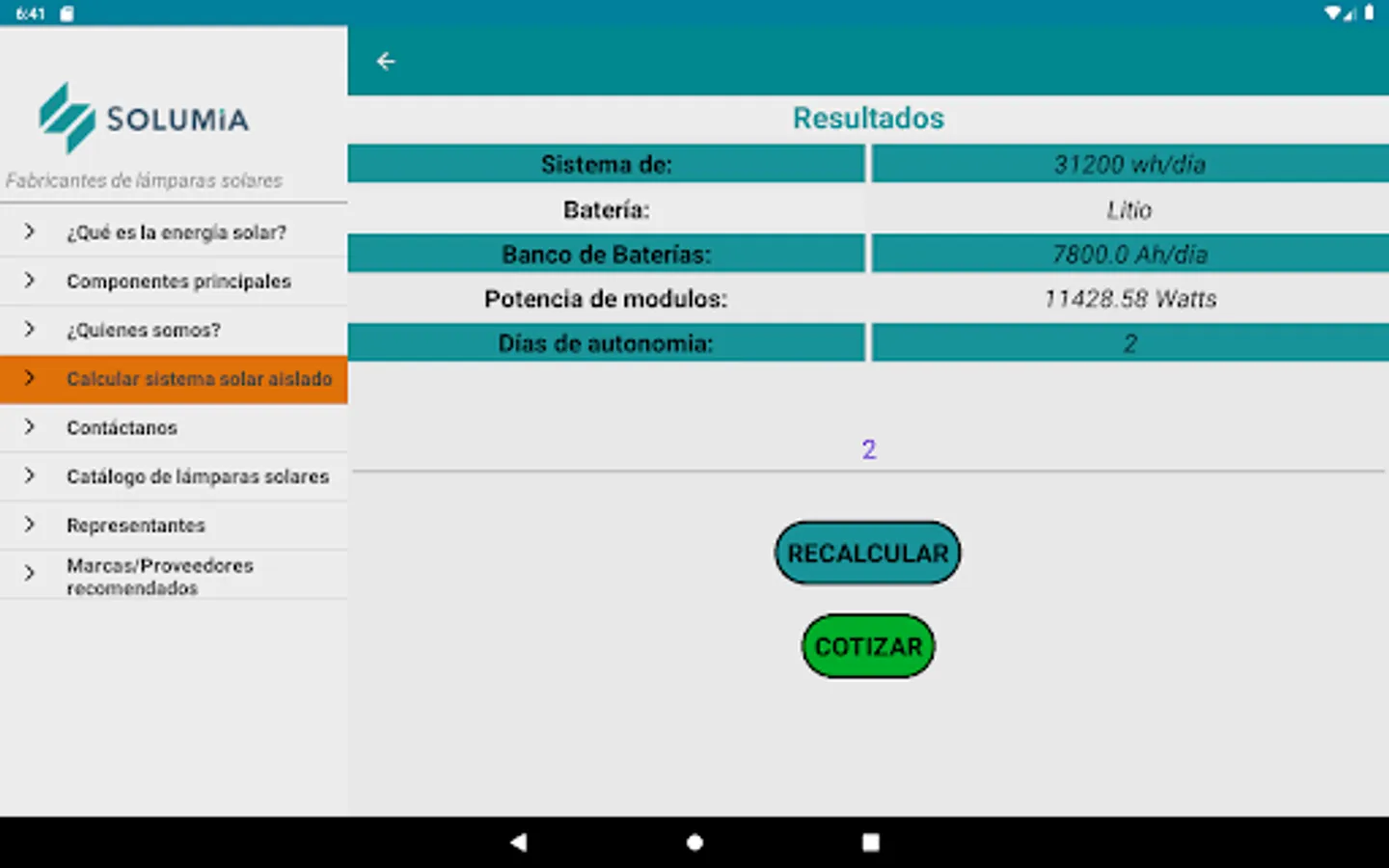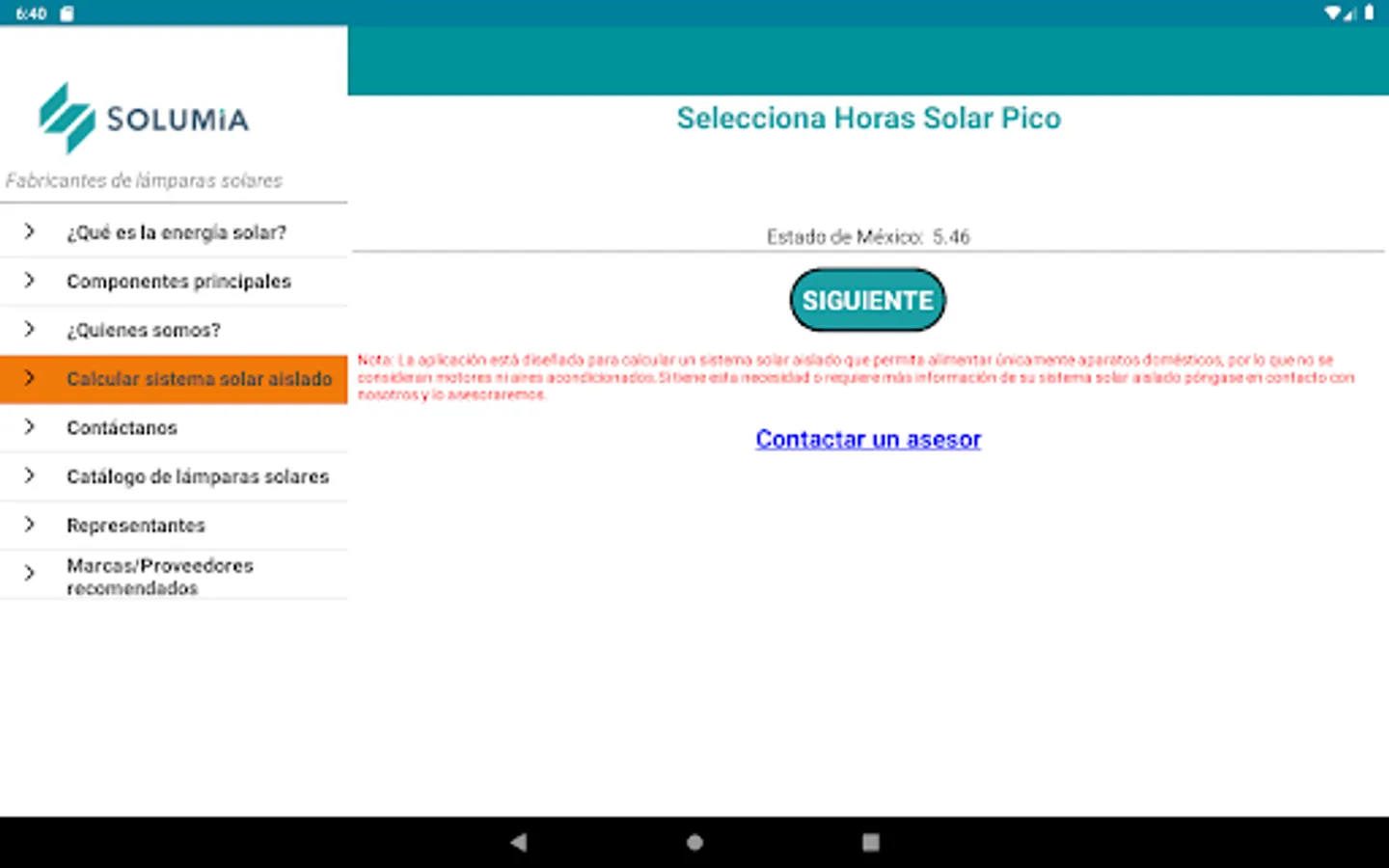 Application that allows the basic calculation for an isolated solar system and provides information on equipment, brands, components, as well as contacts in renewable energy