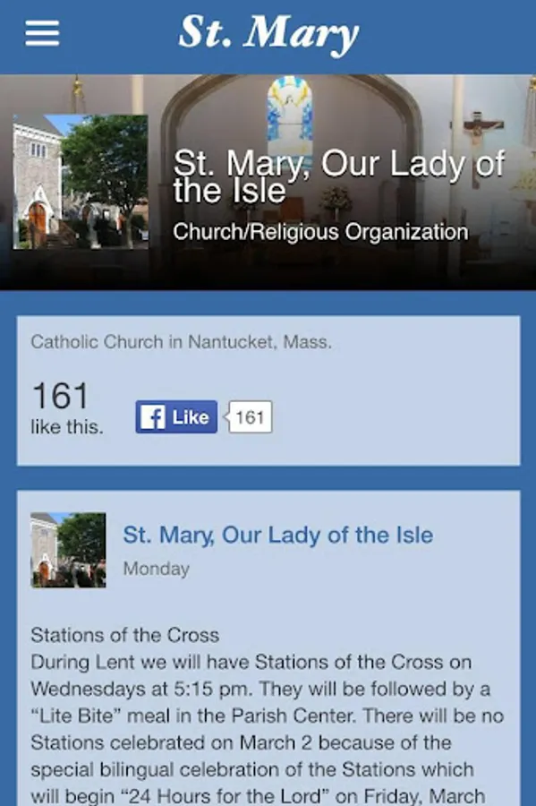 Our app will help you stay connected with everything here at St. Mary, Our Lady of the Isle Catholic Church in Nantucket, Massachusetts. You will find direct access to parish news, calendar, and our Mass times. For those that are new, or have been away for a while, we have information to help you learn about the Catholic faith. We also have many resources to help you pray, including Daily Readings in text and audio form, along with some very useful links.