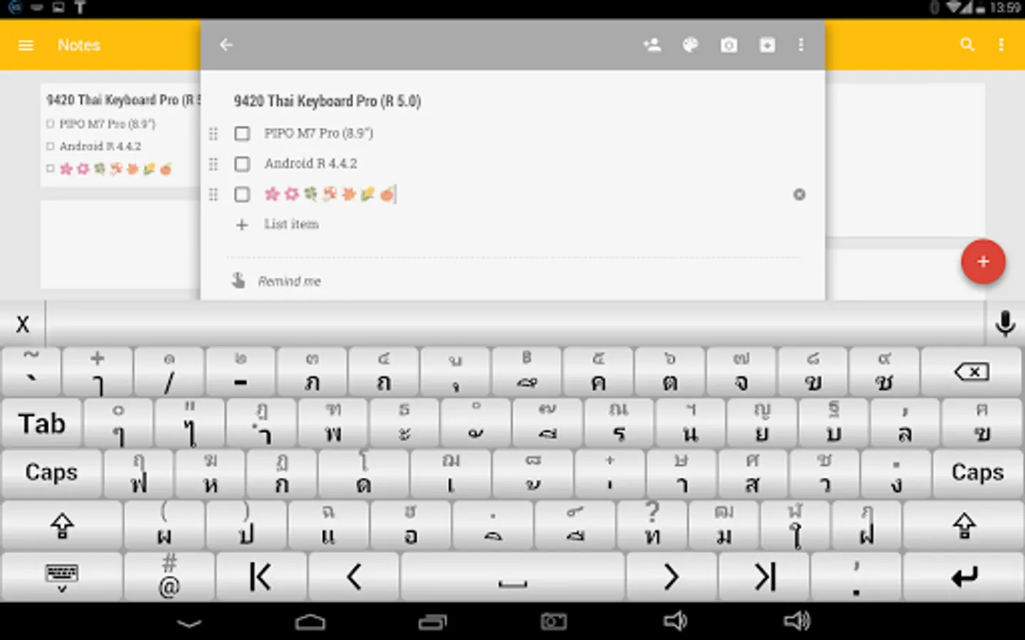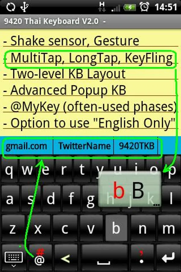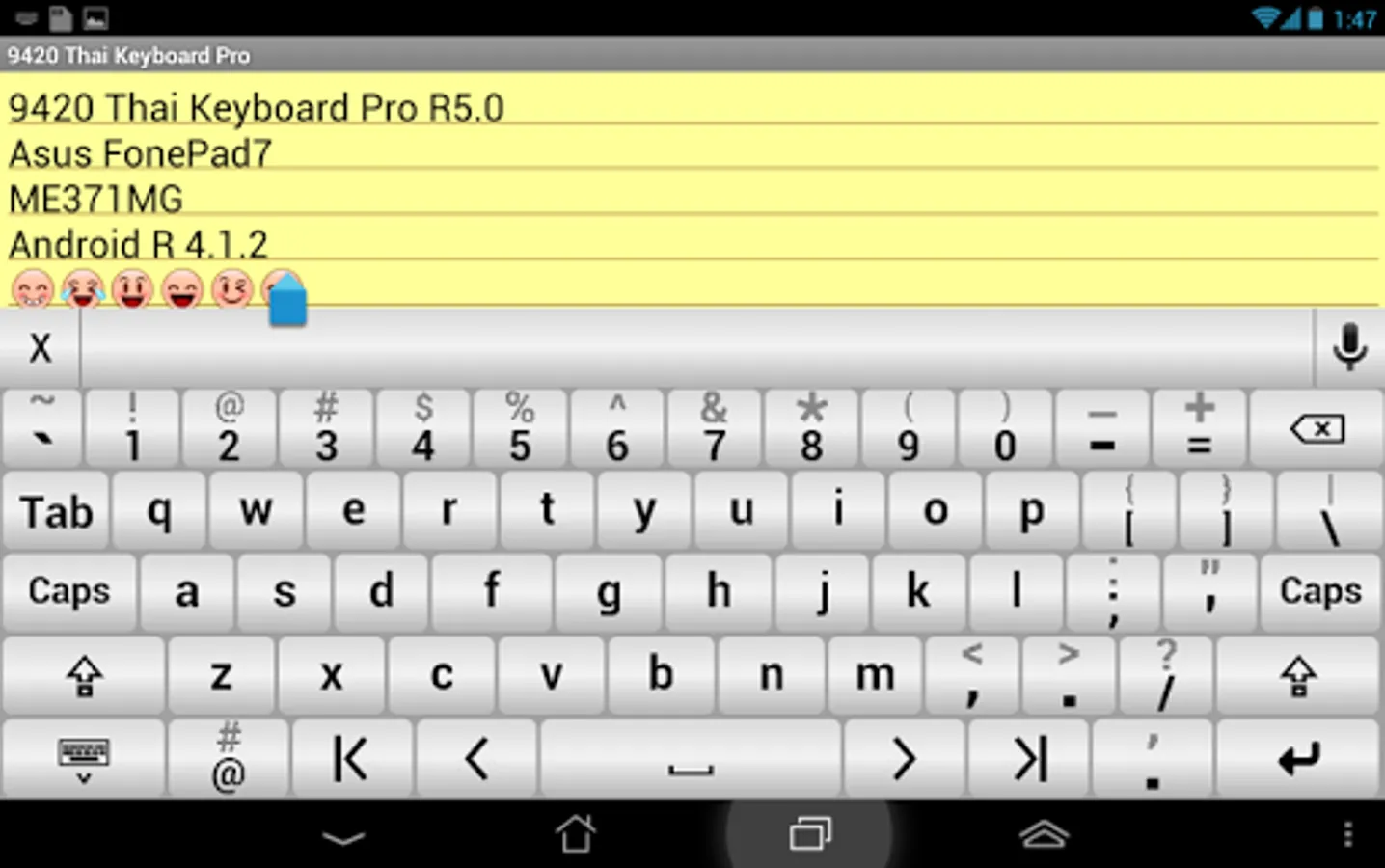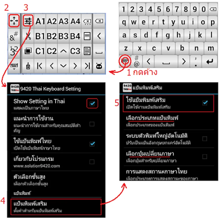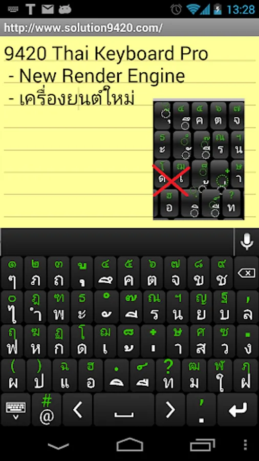 9420 Thai Keyboard for Android is a free Thai/English keyboard software (with built-in "Full" Thai/English word database) that designs for using "finger" and optimizes for text-hungry apps like LINE, Twitter, FaceBook.