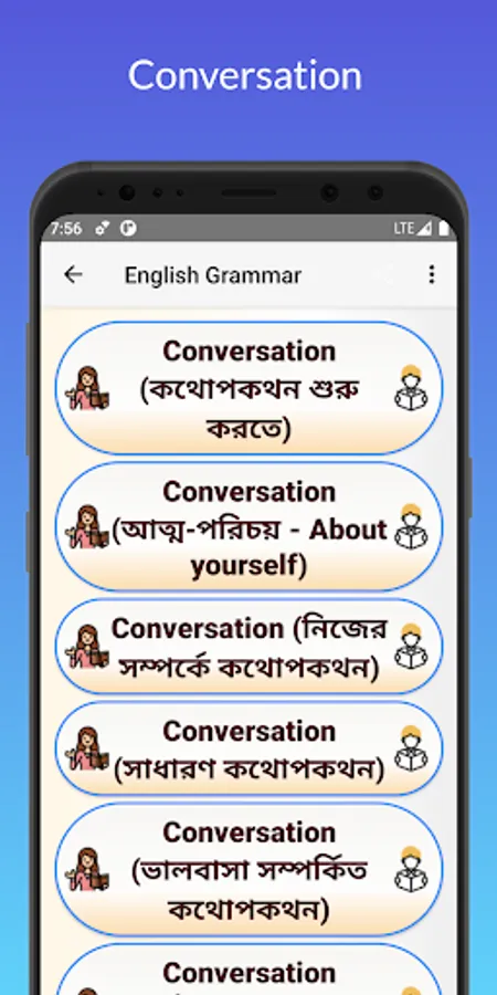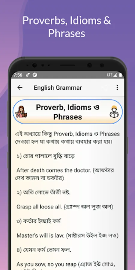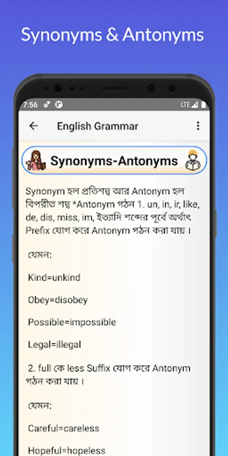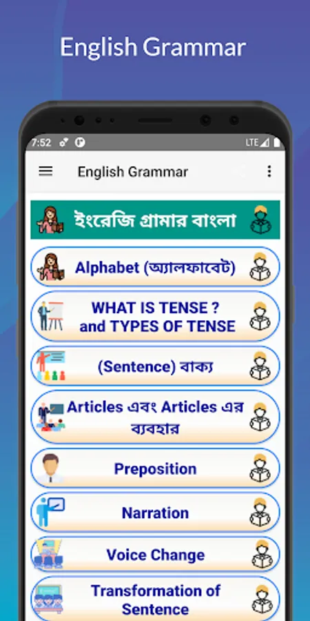 This app contains Alphabet, Sentence, Articles and Articles, Use of Tense, Appropriate Preposition, Completing Sentence Rules, Preposition, Right Form of Verbs, Transformation of Sentence, Voice Change, Narration, Degree and Change of Degrees , Punctuation, Pronoun Reference, Sentence Connectors, Uses of Some Special Words or Phrases, English Language Lesson-Modifiers, Synonyms-Antonyms and Tag Questions, How to Question, Proverb, Ideas and Phrases, Punctuation, English Speaking Formula, Spoken English, English Vocabulary Word Lists also.