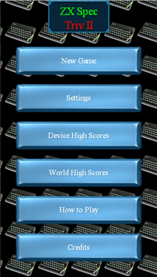 ZX SpecTriv II has a set of high score tables. Two high score tables are maintained for each category of quiz, one for the high scores on your device and another for the world high scores. You can of course choose not to submit your high scores.