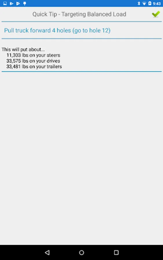 If equally balancing the axles makes an axle go over limit, the app will elect to keep the axles legal but out of perfect balance.