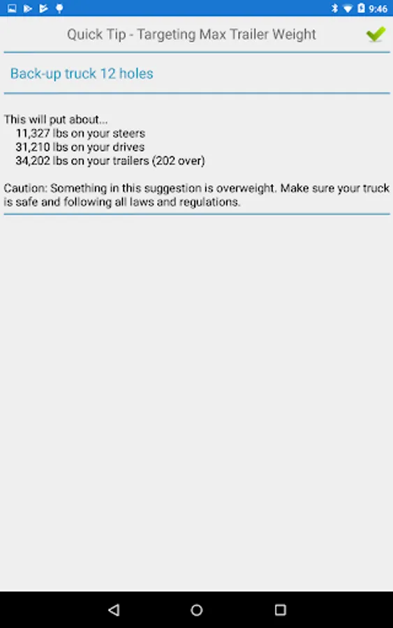 Last, if every axle can't be legal at the same time, the app automatically suggests a hole where your trailers will be just under their limit, and puts the rest of the weight on your drives. That way you can remove the extra fuel and get legal before a DOT Scale.