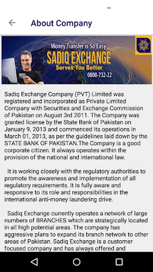 Sadiq Exchange Company (PVT) Limited was registered and incorporated as Private Limited Company with Securities & Exchange Commission of Pakistan on August 3rd 2011. The Company was granted license by the State Bank of Pakistan on January 9, 2013 and commenced its operations in March 01, 2013, as per the guidelines laid down by the STATE BANK OF PAKISTAN.The Company is a good corporate citizen. It always operates within the provision of the national and international law.