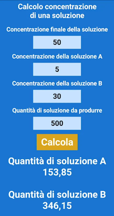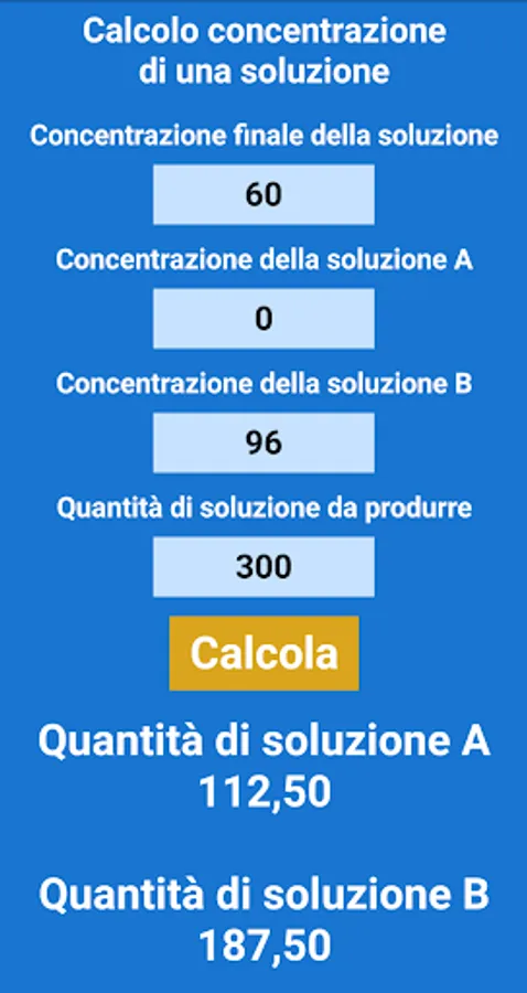 Calculation tool for changing the concentration of a solution. Very useful when it is necessary to produce hydroalcoholic-based plant extracts (mother tinctures and tinctures), because the types of substances that are solubilized depend on the alcohol content. It is also useful in other areas, for example in the production of perfumes.
