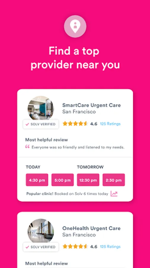• Same-day availability: 100% of Solv customers can book an urgent care visit in the next 24 hours.