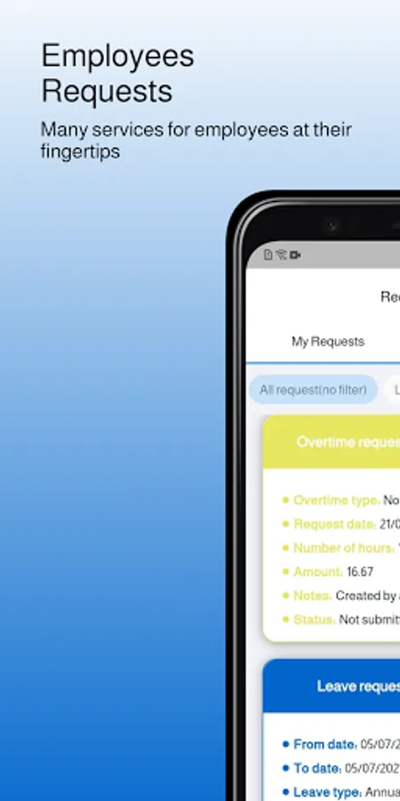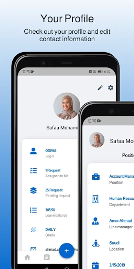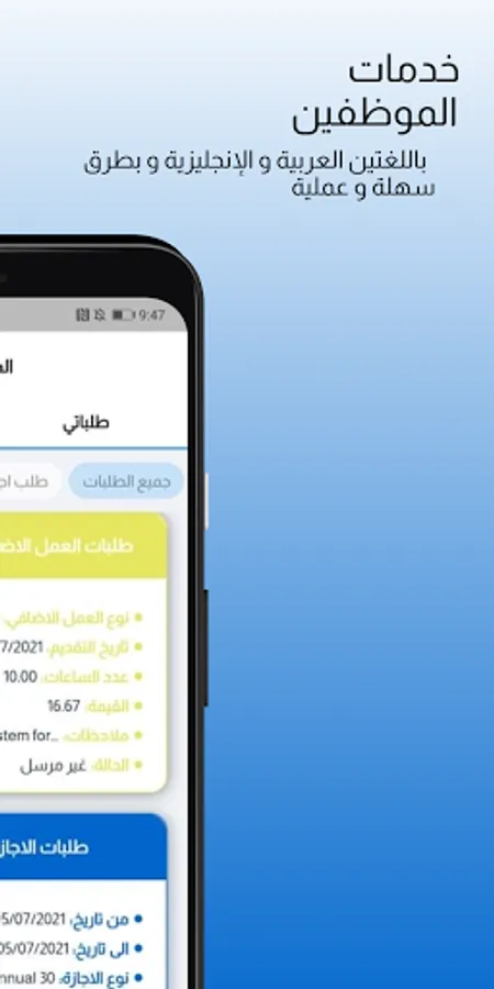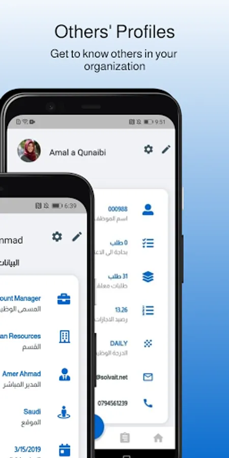 Solvait mobile provides you with 22+ services and inquiries that reads directly from Solvait HR & Payroll in both languages: English and Arabic.
