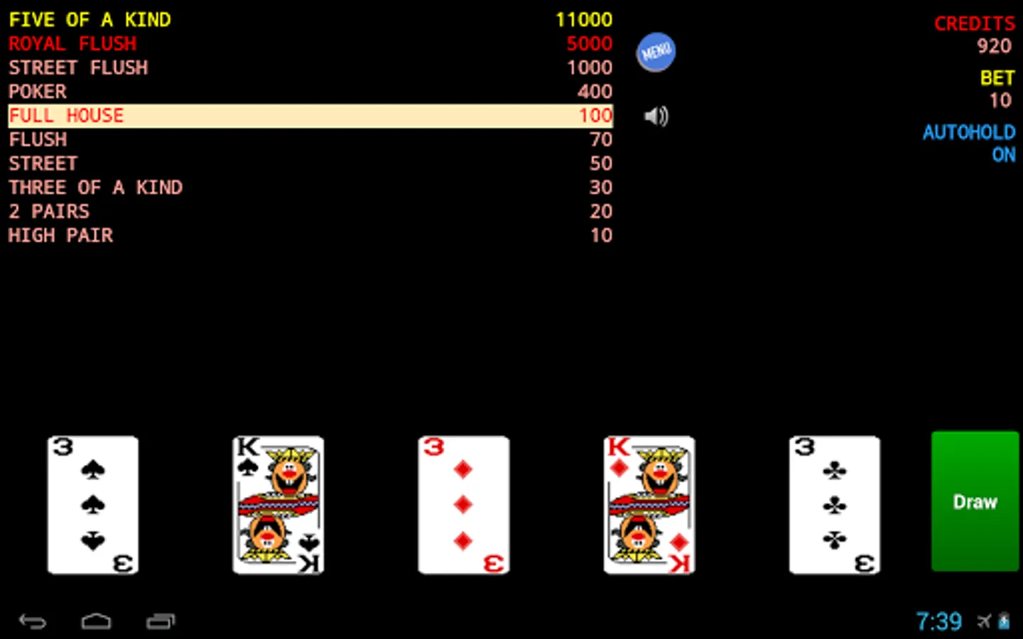 Auto Hold feature automatically puts the desired cards on hold. Therefore the player automatically plays according to the optimal strategy. Players can switch Auto Hold feature ON or OFF tapping on it.