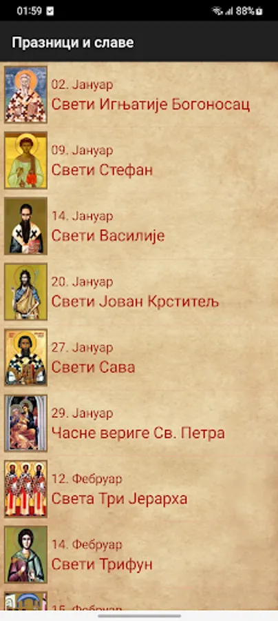 - Празнике и крсне славе. Сваки празник и крсна слава, осим датума садрже и икону као и житије свеца.