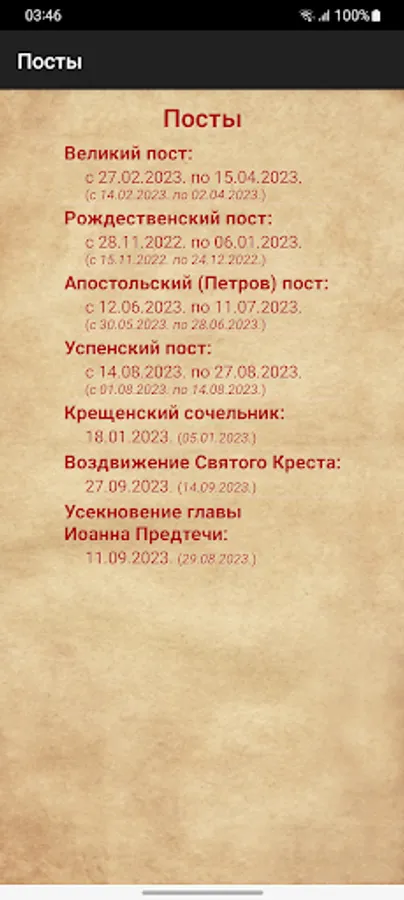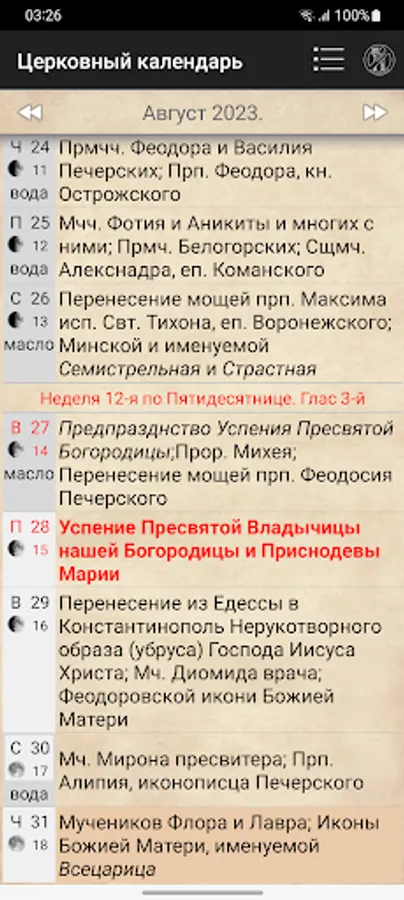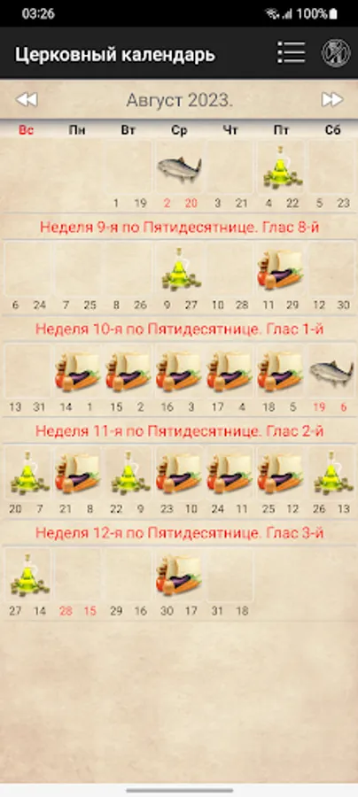 and post types. The calendar has three types: text, icons of saints and a graphic view for the period of fasting.