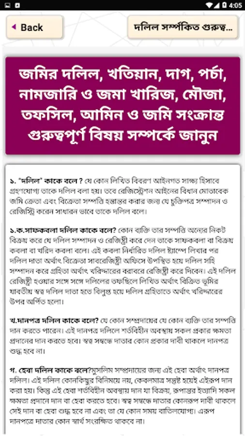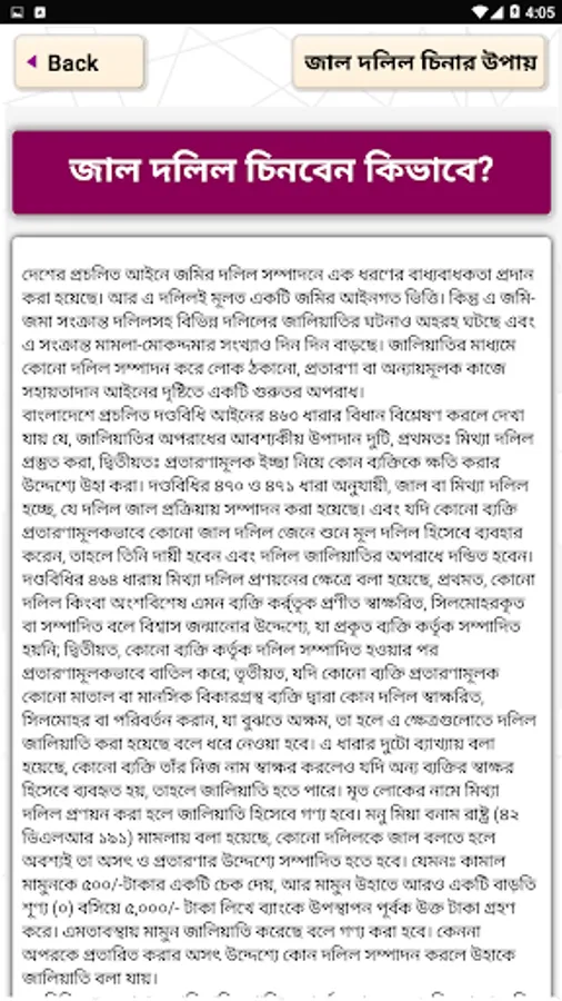 দলিল কথাটির সাথে সবাই কমবেশি পরিচিত। দলিল বলতে অনেক কিছুকেই বুঝায় আমরা আজকে কথা বলবো জমির দলিল নিয়ে। যে কোন প্রকার জমি ক্রয় বা বিক্রয় এর ক্ষেত্রে সবচেয়ে জমির দলিল এর উপর বেশি গুরুক্ত দেওয়া হয়। জমি কেনার ক্ষেত্রে যা আমাদের কে বেশি দেখতে হয় তা হল জাল দলিল কিনা। আজকে আমাদের এই অ্যাপে আমরা জাল দলিল চিনার উপায় গুলি আপনাদের জানাবে। যে কোন জমির পরিমাপ দলিলে নথি ভুক্ত থাকে। আমাদের সকলকে জমির পরিমাপ জানতে হয়। যে কোন জমির হিসাব বা জমির পরিমাপ জানা না থাকলে আমরা সমস্যায় পড়ি। জমির হিসাব বা জমির পরিমাপ জানা আমাদের খুবই প্রয়োজন। ভুমি পরিমাপের জন্য অনেক গুলি উপায় আছে। ভুমি পরিমাপের সকল বিষয় গুলি দলিলে থাকে। যে কোন জাল দলিল চেনার জন্য আমাদের কে ভুমি ও রেজিস্ট্রি সেবা অফিসে যোগাযোগ করতে হয়। কারন ভুমি ও রেজিস্ট্রি সেবা কেন্দ্রে আমরা ভুমি আইন সর্ম্পকে জানতে পারি। আর ভুমির আইন জানা আমাদের দরকার। আমরা জমি কেনার আগে ভূমি পরিমাপ দেখার প্রয়োজন আছে। সে জন্য আমরা ভূমি পরিমাপ দেখার জন্য ভূমি ও রেজিস্ট্রি সেবা অফিসে যোগাযোগ করতে পারি। তাতে করে আমরা জমি কেনার আগে ভূমির আইন সর্ম্পকে জানতে পারবো যা আমাদেরকে সহযোগীতা করবে কোন প্রকার ধোকাবজির কবলে পড়লে আমরা ভূমি আইন এর সহযোগীতা নিব। ভুমির মাপ ও তথ্য আইন আমাদেরকে নিশ্চয়তা দেয় এই ব্যাপারে যে জমির হিসাব ঠিক আছে। ভূমির তথ্য ও আইন সব সময় আমাদের সাথে আছে। ভূমির মাপ যদি ঠিক থাকে তাহলে আমরা ভূমির দলিল দেখবো । ভুমির মাপ যদি দলিলে ঠিক থাকে তাহলে আমরা জমি দেখে কেনার জন্য প্রস্তুতি নিব।