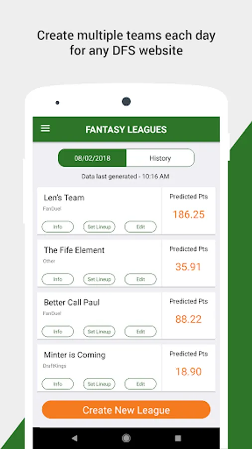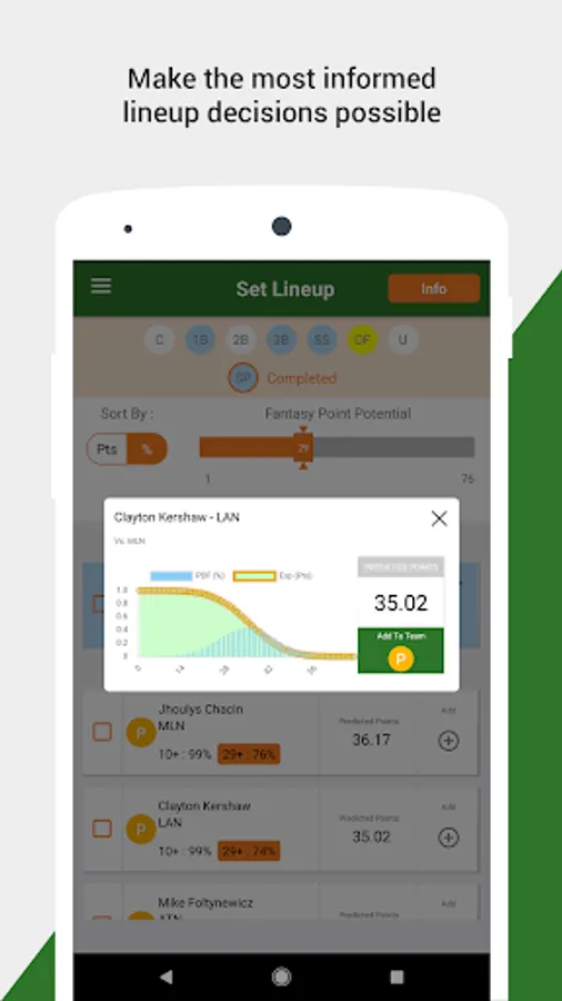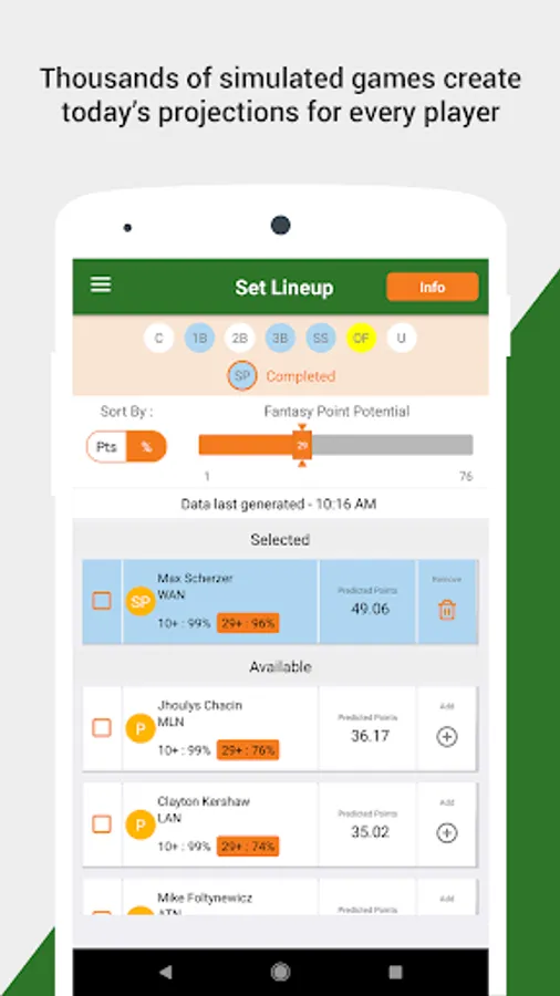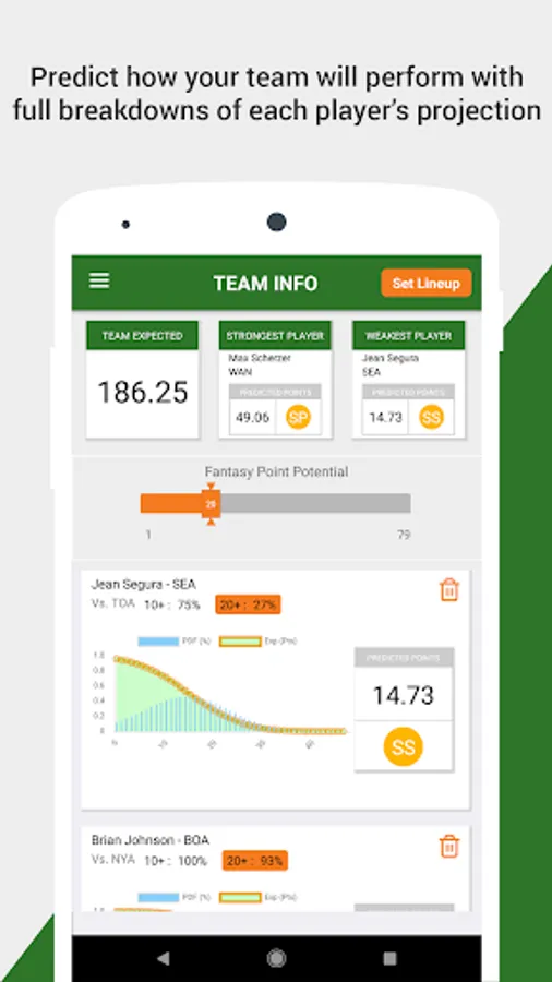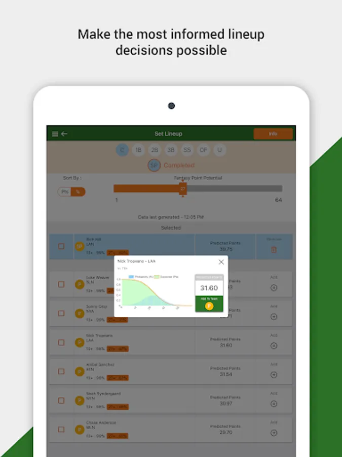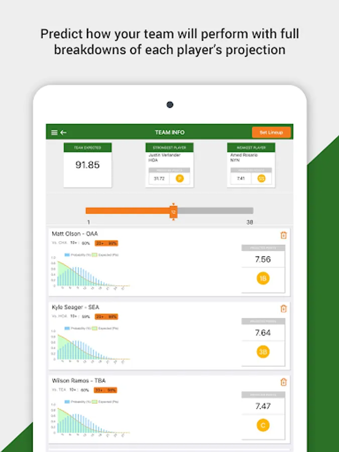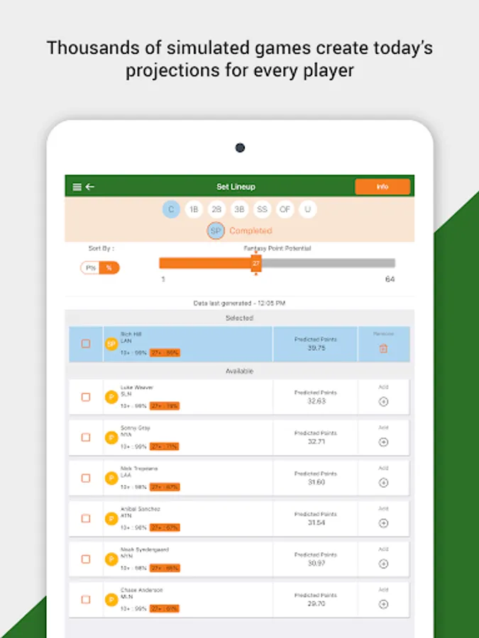 The DFS Predictor app runs thousands of games in the background with the time-honored Strat-O-Matic game engine. Players’ projected stats and fantasy points are displayed. The Predictor app also shows you the percentage chance your player will hit various fantasy-point milestones (or fantasy-point totals).
