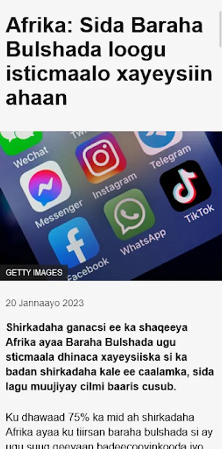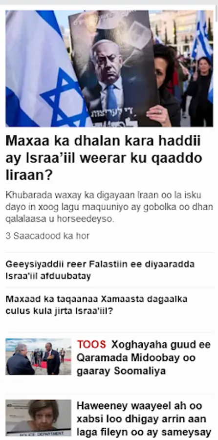 Marka laga soo tago quudinta tooska ah ee TV-ga, Appku waxa uu bixiyaa xulasho ballaaran oo ah wararkii ugu dambeeyay ee af-soomaaliga ee adduunka oo dhan. Laga soo bilaabo digniinta jebinta wararka ilaa maqaallo sifo qotodheer leh, isticmaalayaashu waxay heli karaan waxyaabo badan oo kala duwan oo mawduucyo kala duwan ah. Haddii aad xiisaynayso siyaasadda caalamiga ah, ciyaaraha, madadaalada, ama caafimaadka iyo sayniska, abka qof kastaa wax buu u leeyahay.