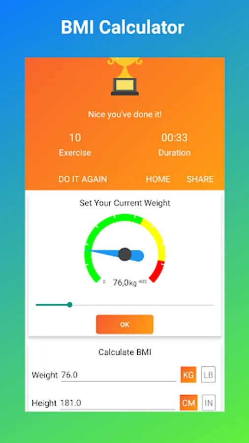 Other features of our free home workouts app include a BMI calculator, workout reminder, customisable rest period and voice coach.