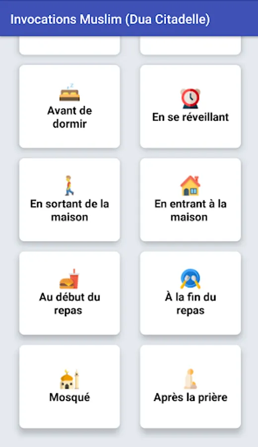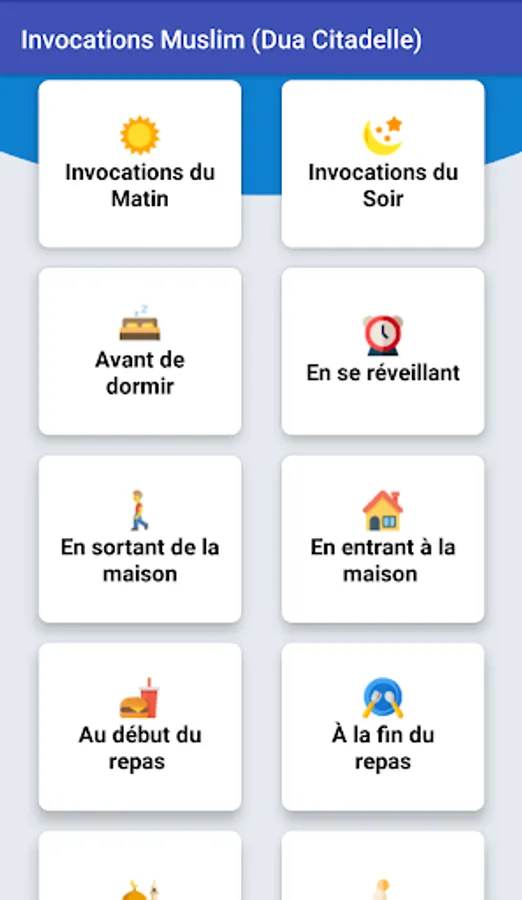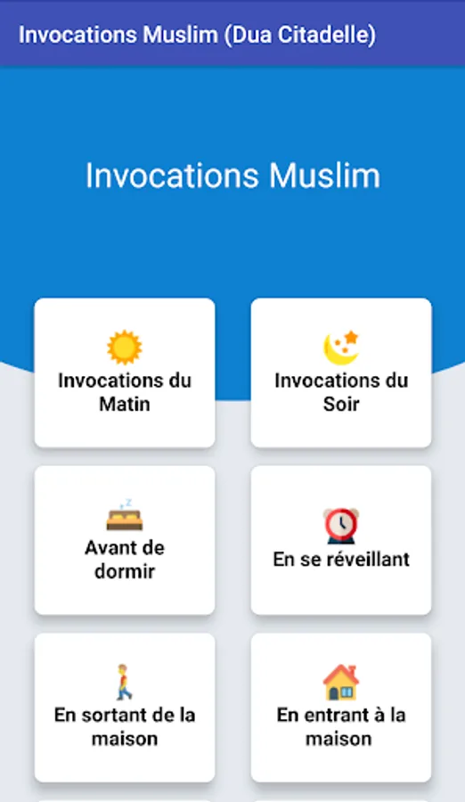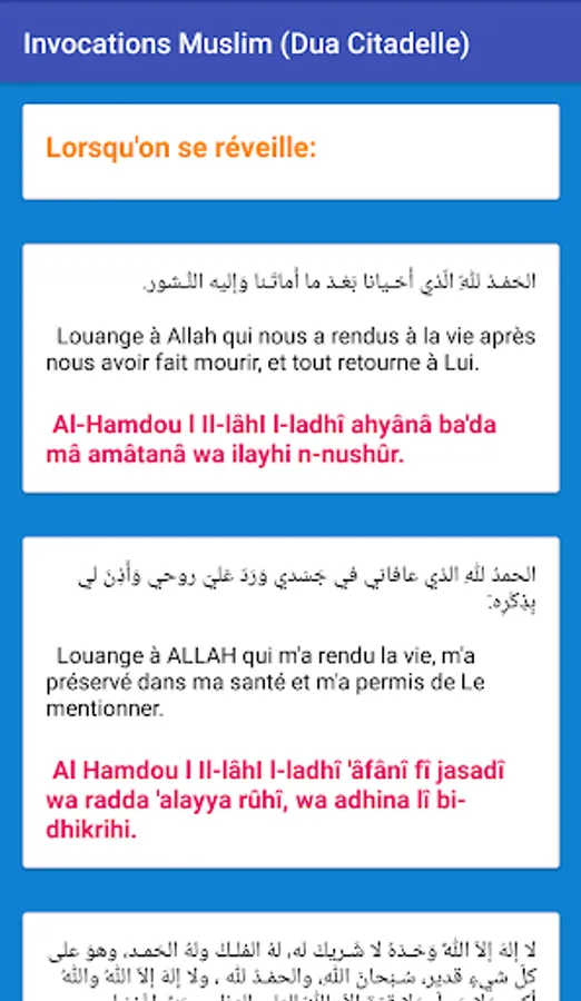 invocation Islam, Application of invocations taken from Hisnu el muslim (The Citadel of the Muslim), by Sheikh Sa'id Ibn Wahf Al-Qahtaani, in French in Arabic and in phonetics, morning and evening invocation, Invocation before sleeping, duaas extracted from the citadel of the Muslim, Islam invocation for children and adults, facilitates the learning of invocations.