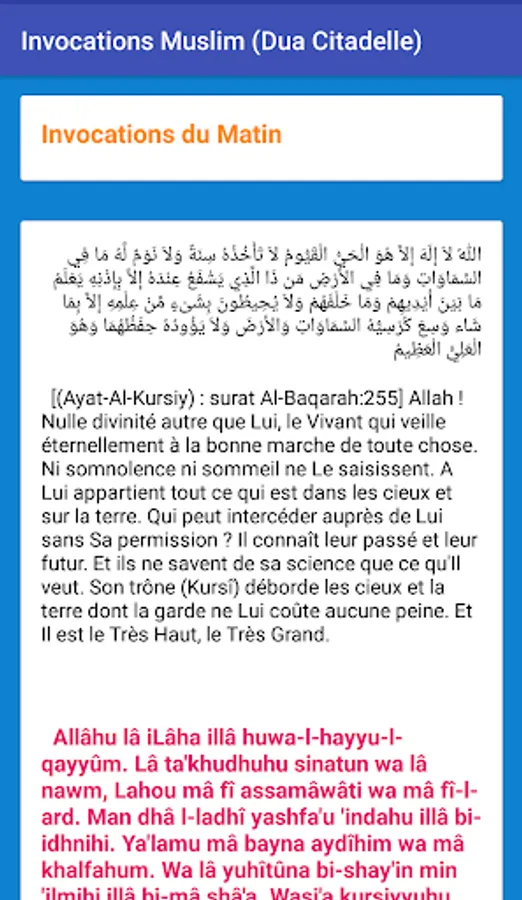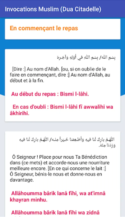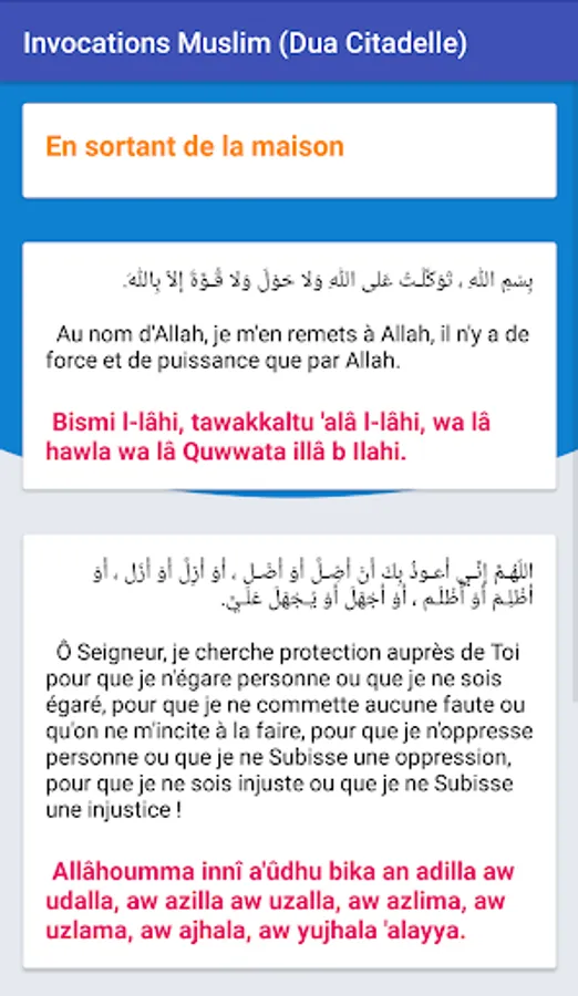 In short this application is free and easy to use contains Douaa (dou3a) extract from the book Hisnu el muslim in French and in Arabic with transliteration and without advertising.