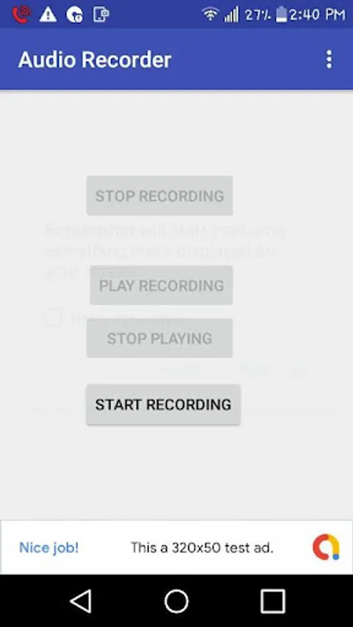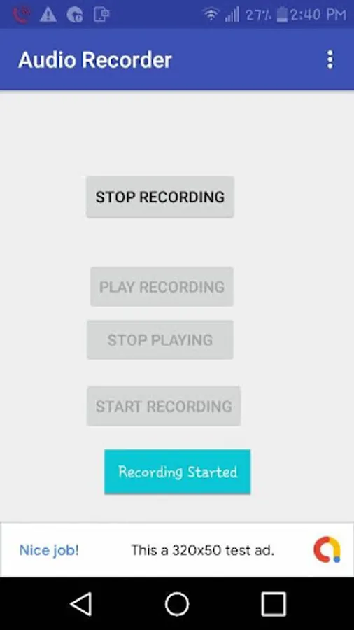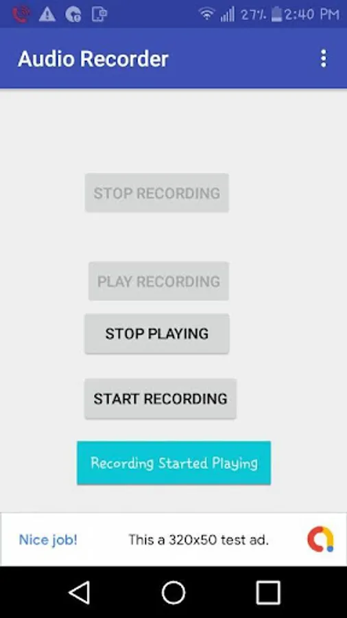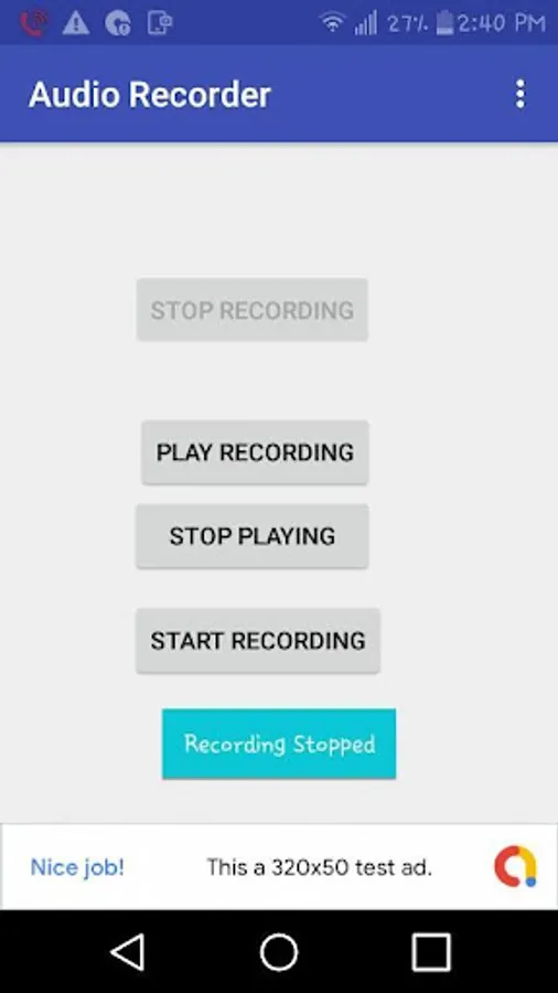 In this app you can record the voice, play the voice, stop the voice and stop the playing voice.This app is designed for audio recording.