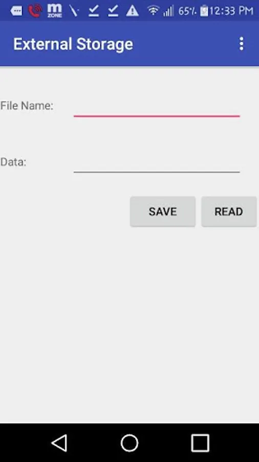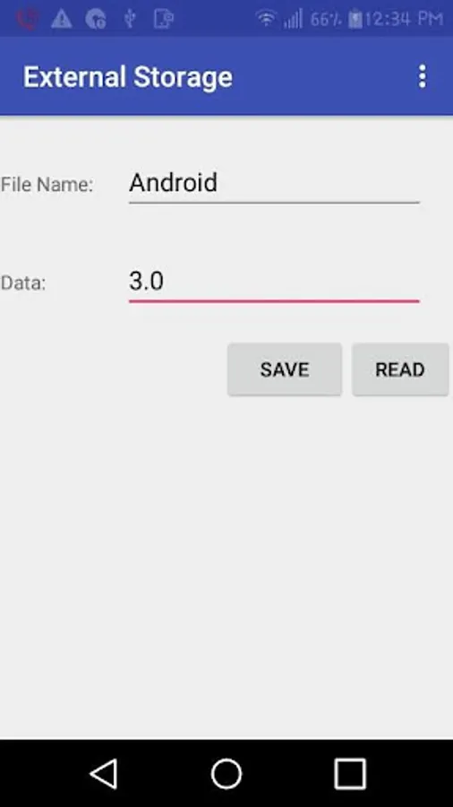 By this app you can save and read data of file of external storage.This app is designed for save and read data of external storage.
