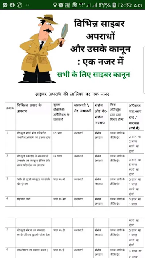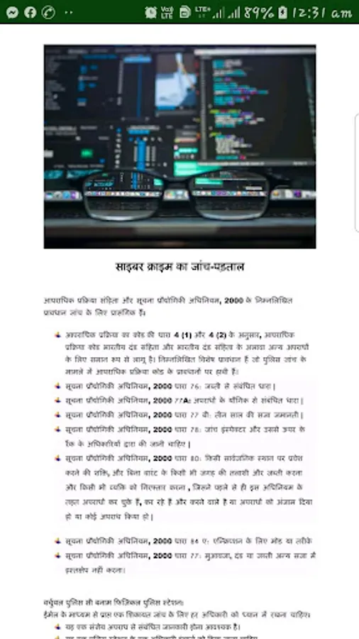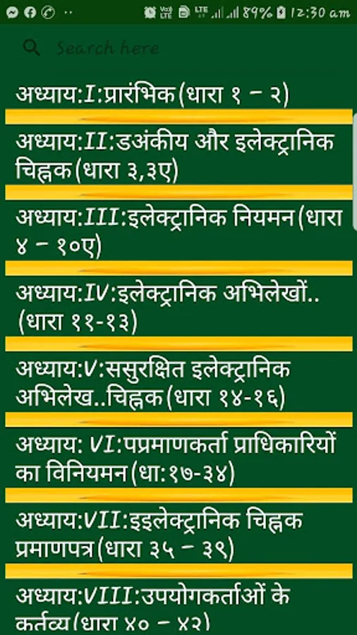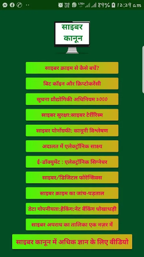 The first first button from the top in the main activity will take one to a gist of cyber laws in India including some tips as to how one be secured in the cyber world. The third button will lead one to various chapters of the Information Technology Act in Hindi. Clicking on chapter we can read the various provisions under the said chapters in Hindi. Second chapter is on the latest information of law Bitcoin and cryptocurrencies in India.From four various important chapters provide us a insight knowledge on issues related to cyber world, data privacy, cyber security and admissibility of electronic evidence in court room.