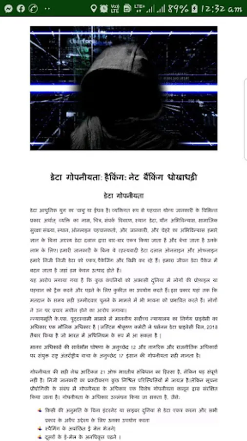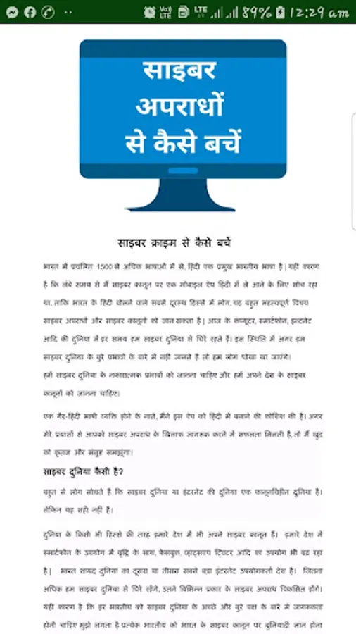In this app there are practical discussion on what a common man do to save his or her life from the dangerous effect of cyber crimes which is increasing day by day. The awareness is the most important way to save our life. This App also discuss on cyber forensics, obscenity, investigation data privacy, bitcoin, net baking issues and cyber security all in Hindi so that the people in Indian can easily understand and do the needful.