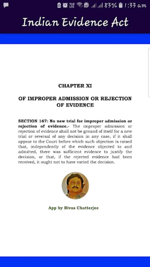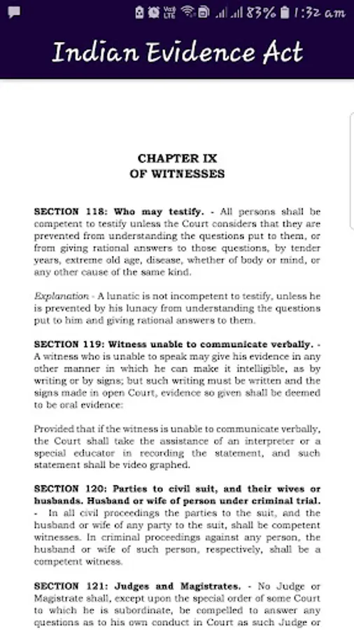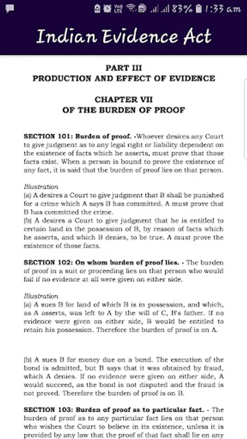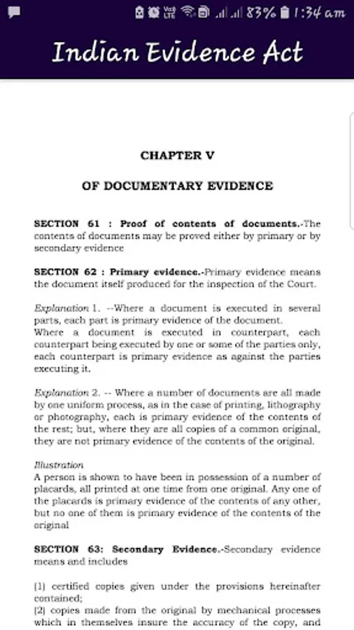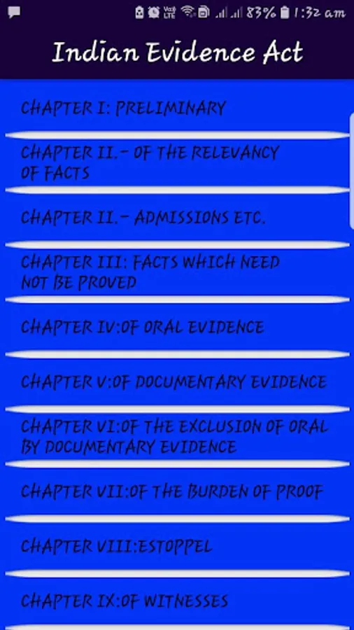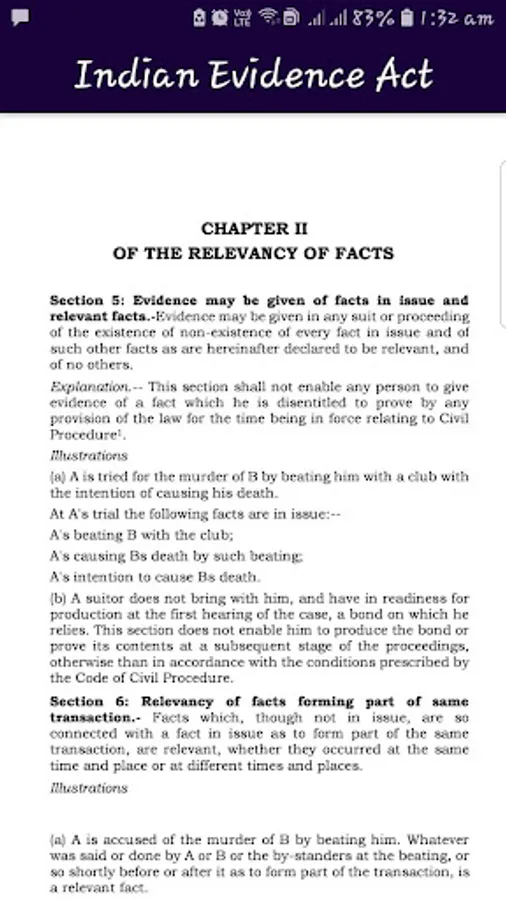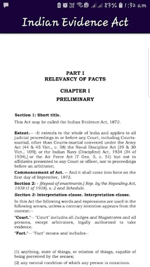 What is evidence, how it is dealt or how it is understood or appreciated is a very important issue in any country or society. Out Evidence Act provides the very definitions of what is evidence. The admissibility and relevancy of evidence are the most precious factors in dealing with evidence. The Indian Evidence Act, 1872 has three Parts and Eleven chapters. This app provides various chapters of the Indian Evidence Act, 1872 which are as follows: PART I: RELEVANCY OF FACTS: CHAPTER I: PRELIMINARY