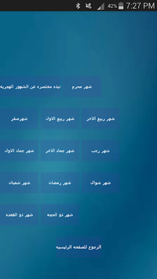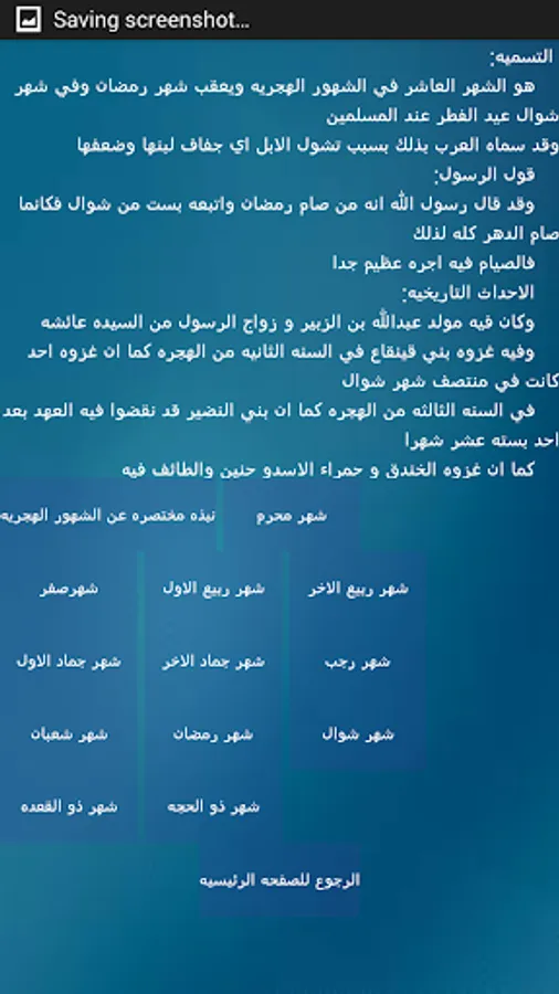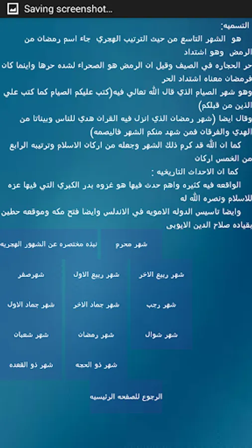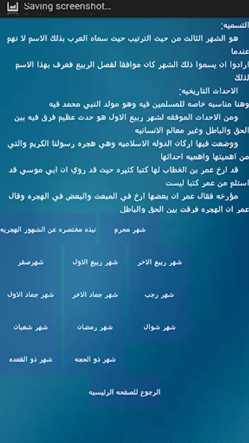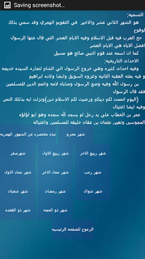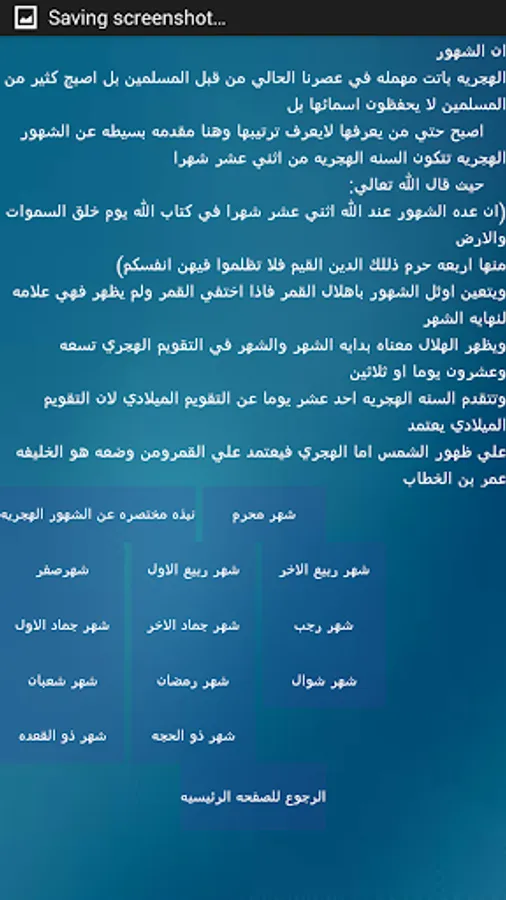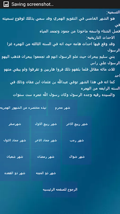 هو تطبيق من خلاله يمكنك معرفه معلومات عن الشهور الهجريه حيث يمكنك معرفه مايدل عليه تسميه الشهر ولماذا سماه العرب بذلك الاسم وهل فيه حديث للرسول وماحدث فيه من معالرك وحروب وبالتالي فهو نطبيق مثري للمعلومات وثقافي جدا
