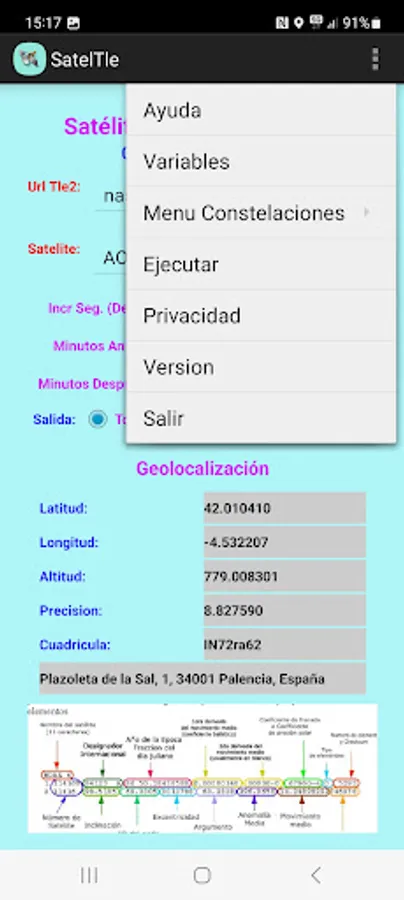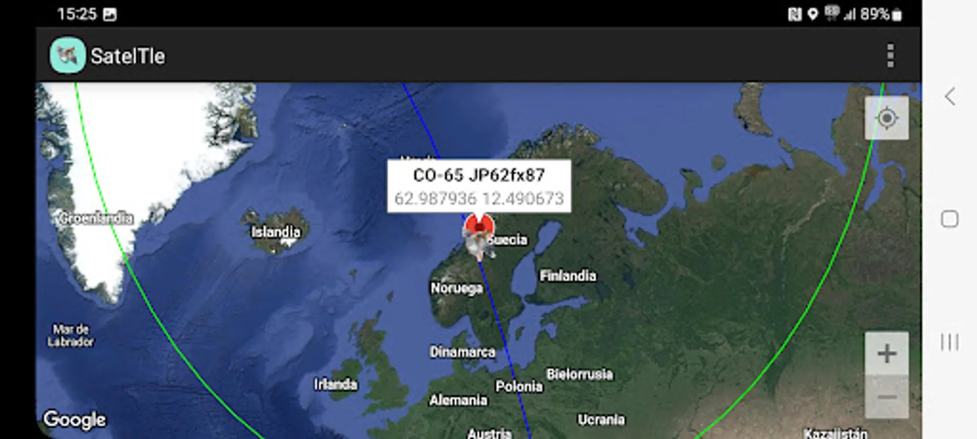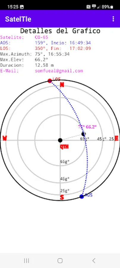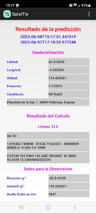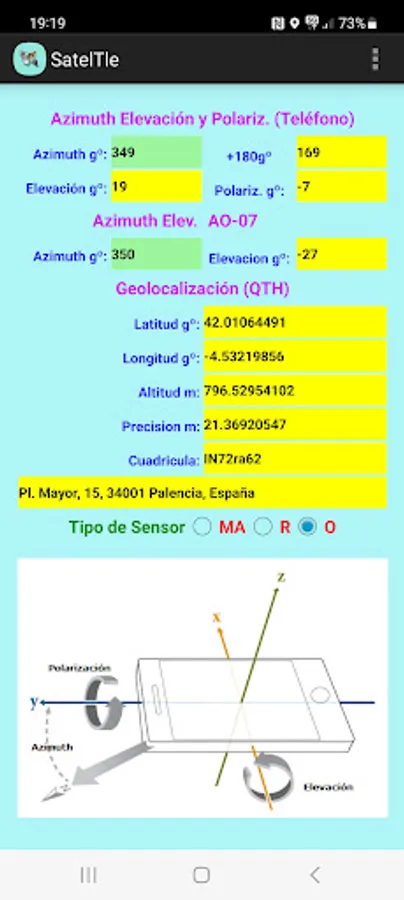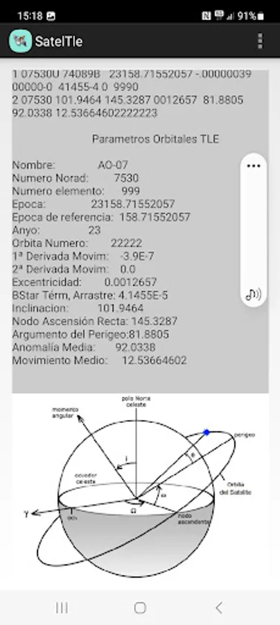 This APP predicts the position of a Satellite with the TLE2 data through the SGP4 SDP4 protocol. It gives us the position in Longitude, Latitude and Altitude as well as the Grid, Maidenhead Locator System (QTH Locator and IARU Locator), also the Orbital parameters and data of the next step by the local position where we are (QTH), we can see a graph in polar coordinates of the next step, in location data Azimuth, Elevation, Time etc. It allows us to see the orbit on a map and generates a KML file in an external folder /Documents/Kml that allows us to project the satellite's orbit in Google Earth.