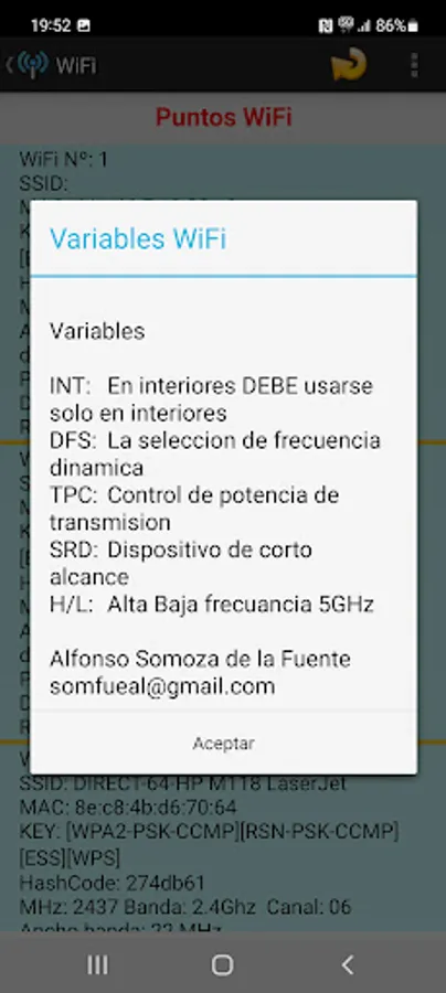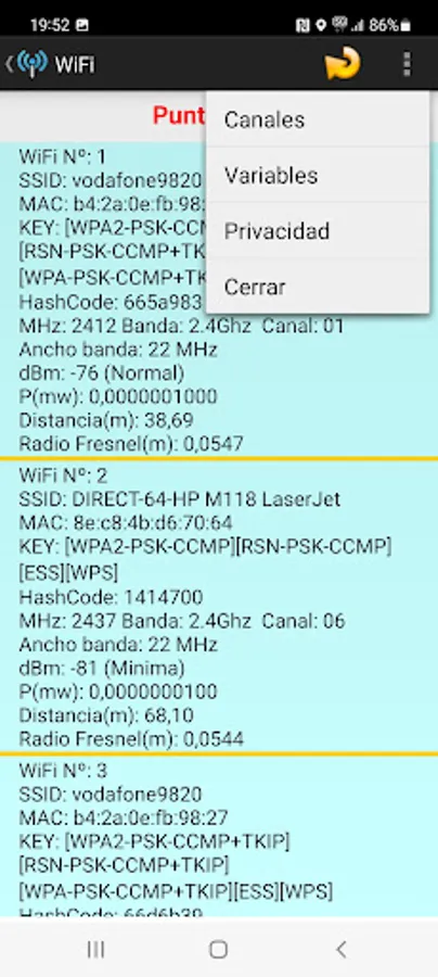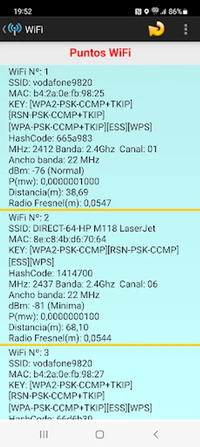 List the nearby WiFi points listing some of their characteristics, SSID, MAC, Frequency, Band, Power, Distance, etc.