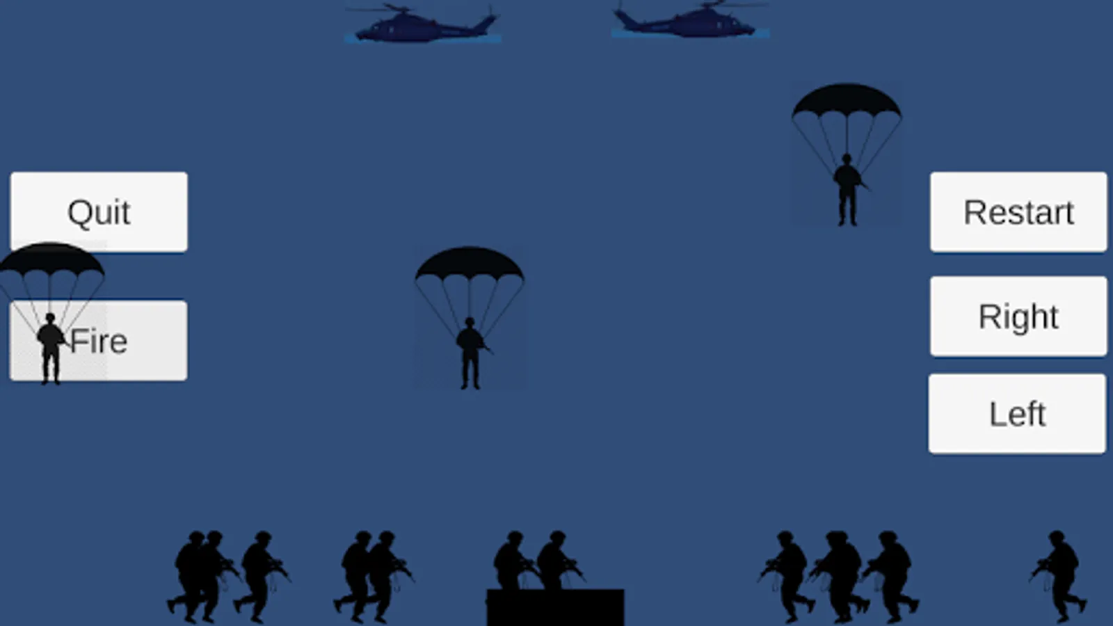 The player has to save his plane-shooting gun from the pratroopers and the bomb. The gun can be rotated using the Right and Left buttons on the screen. There is a Fire button to fire bullets at the enemies.