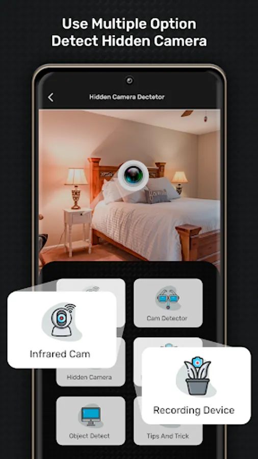 Hidden Camera Detector easily detects hidden camera. 📸 if you can click on the infrared camera detector and appear camera screen and focus on your target you move your phone to your targeted place your camera focus on a red light you must think this is a hidden camera and nanny camera this hidden IR camera detector or hidden devices detector is the best solution of your family privacy.